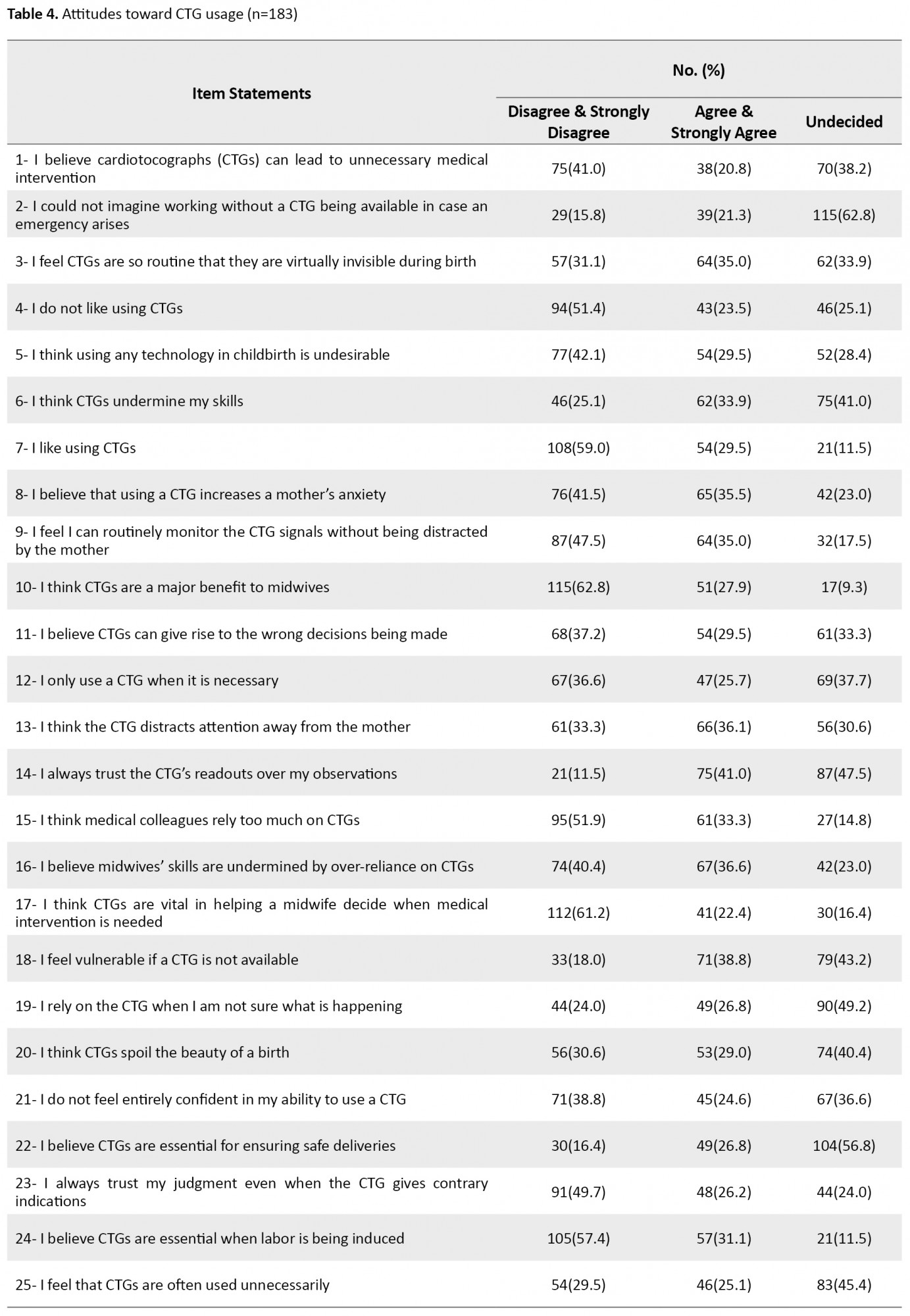 The correlation between knowledge and attitudes is well-studied. The midwives’ attitudes in the current study were unfavorable toward the use and importance of CTGs in clinical practice. The midwives reported disagreement with statements regarding the importance of CTGs in induced labor, in helping the midwife’s decision-making, benefits to the midwife, and the use of CTGs. Our findings contradict previous studies reporting more positive attitudes and satisfaction with using CTG technologies [