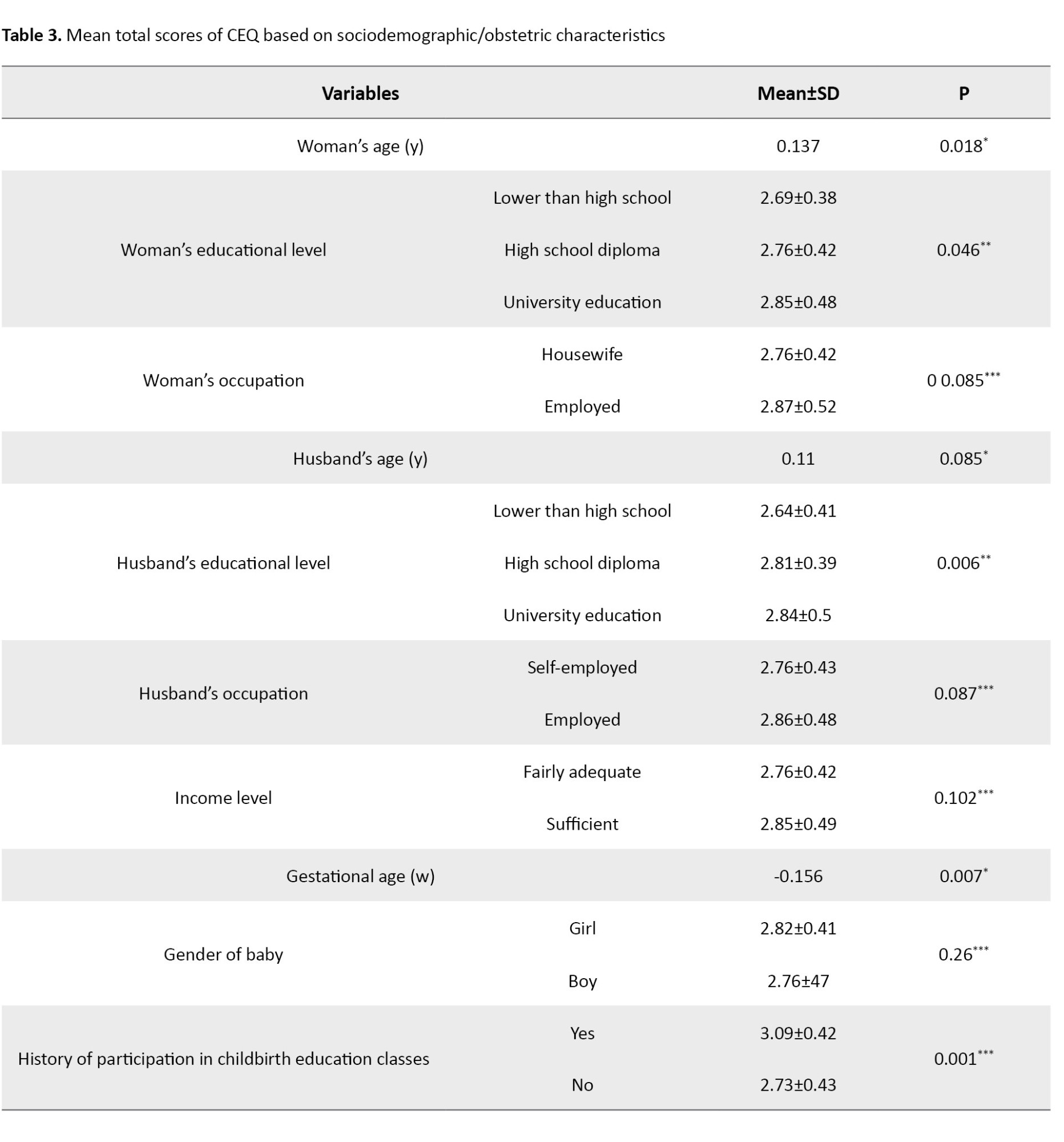 The mean total CEQ score in women with CS was significantly higher than in women with NVD (P=0.001). The results showed a weak significant positive correlation between women’s age and their total CEQ score (r=0.137, P=0.018). In addition, a statistically significant difference was observed in the total CEQ score based on the women’s education level (P=0.046) and their husbands’ educational level (P=0.006); the women with higher education levels had higher total CEQ scores, and the women whose husbands had higher educational level had higher total CEQ scores. A weak, significant negative correlation was observed between women’s gestational age and their total CEQ score (r=-0.156, P=0.007). The mean total CEQ scores of women who had a history of participating in childbirth education classes (P=0.001), insurance (P=0.043), childbirth in a private hospital (P=0.001) were significantly higher than that of women with no history of participation, no insurance, and a history of childbirth in a public hospital, respectively. Other sociodemographic/obstetric characteristics of primiparous women had no statistically significant relationship with their total CEQ score (