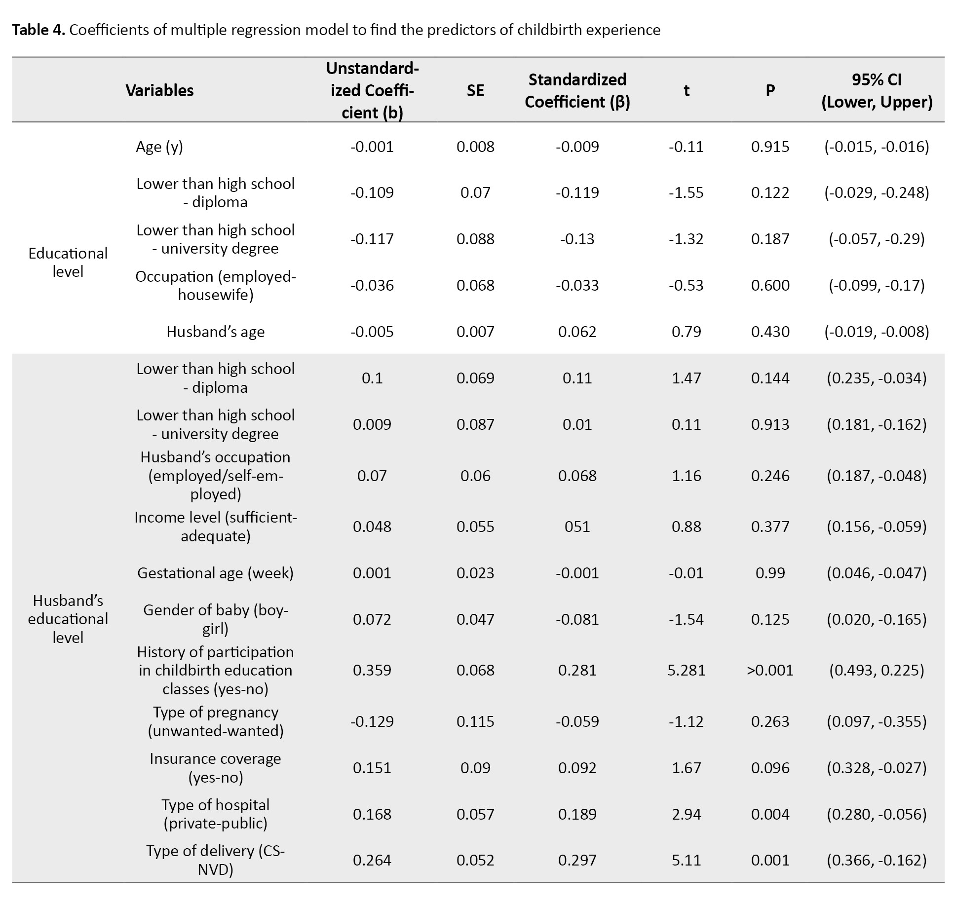32]. The high childbirth experience score at older ages may be because older women deal with pregnancy complications more easily, which leads to a better child birth experience for them.