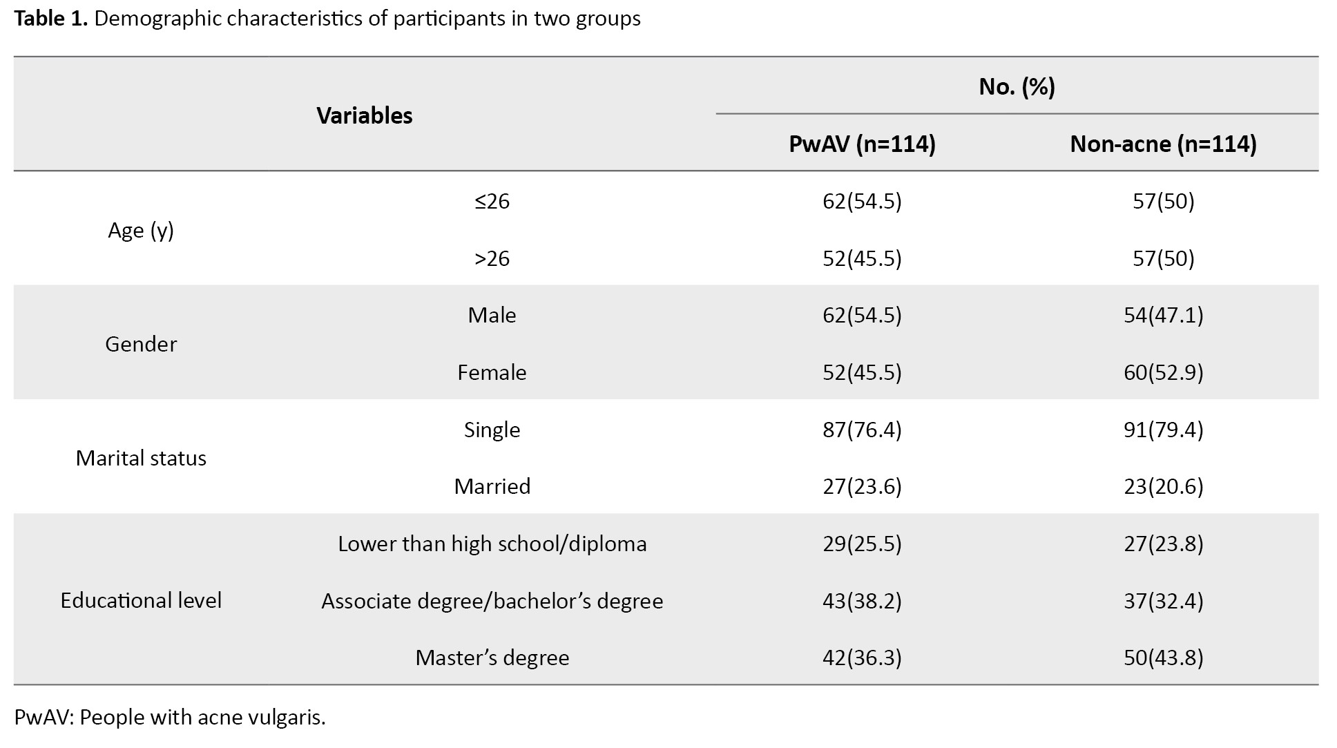 Participants were two groups of PwAV (n=114) and non-acne (n=114), with a mean age of 26.6±4.56 and 27.53±4.71, respectively.
