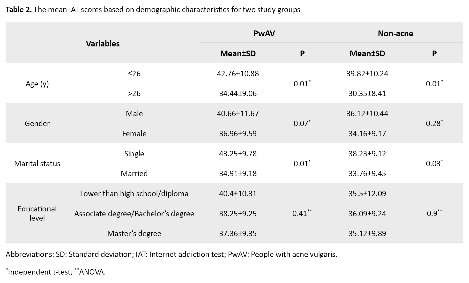 Based on the independent t-test, the IAT score in both groups was significantly higher in people <26 years of age and single people (P<0.05). In other words, being young and single was associated with internet addiction in both PwAV and non-acne groups.