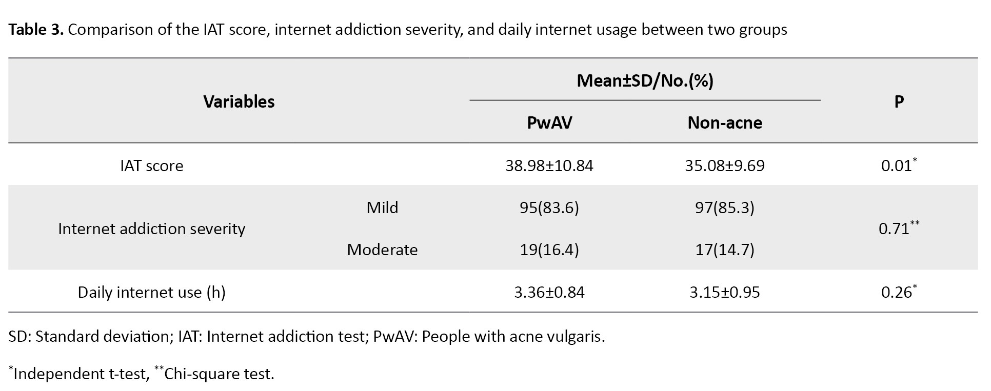 The mean IAT scores of the PwAV and non-acne groups were 38.98±10.84 and 35.08±9.69, respectively. Based on the results, the mean IAT score was significantly higher in the PwAV group than the non-acne group (P<0.05). In terms of severity, the internet addiction in both groups was mild (a score of 31-49), and there was no significant difference between the two groups in terms of internet addiction severity. Also, there was no difference between the two groups in the daily internet use (