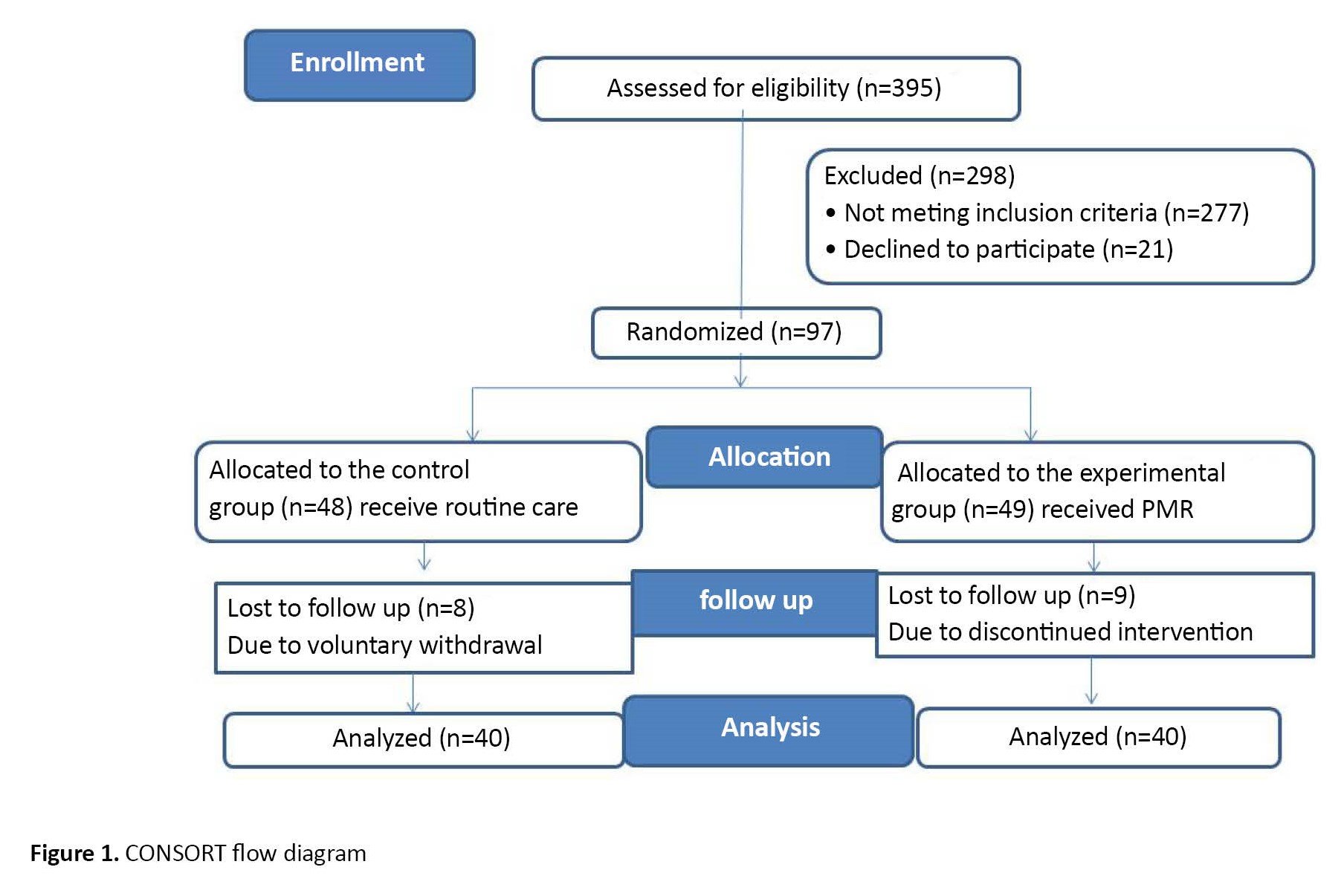During the study period (from March until the end of July 2021), 80 out of 97 students who agreed to participate in the study were assigned to two Equal groups using a random number generator program: The study group (40 students) and the control group (40 students). Also, 17 students were removed because they did not practice PMS for 4 weeks (