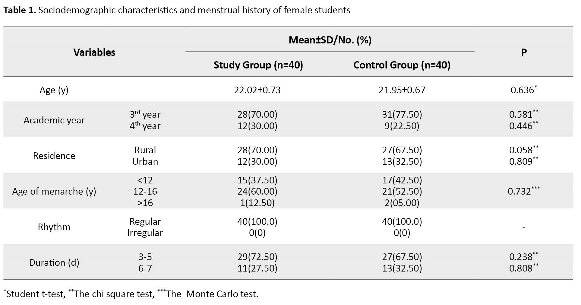 The Mean±SD age among the study and control groups was 22.02±0.73 and 21.95±0.67 years, respectively. Moreover, 70% of the study and 77% of the control groups were in their third academic year. More than 70% and 67.5% of the study and control groups were from rural areas, respectively. Also, 60% of the study group and 52.5% of the control group had their menarche at 12 to 16 years old. All students in both groups had a regular menstrual cycle, with intervals ranging from 21 to 35 days. Moreover, the duration of menstruation spanned 3-5 days among 72.5% of students in the study group and 67.5% of students in the control group (