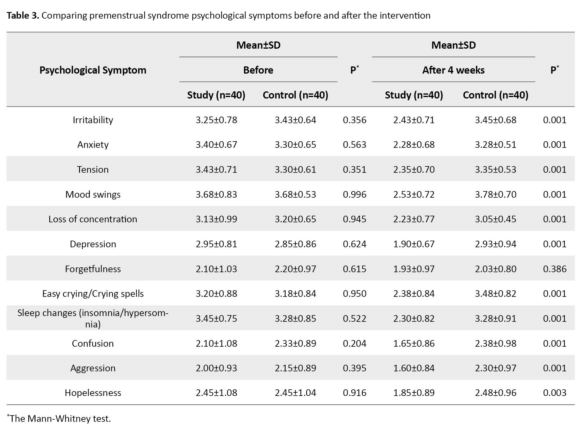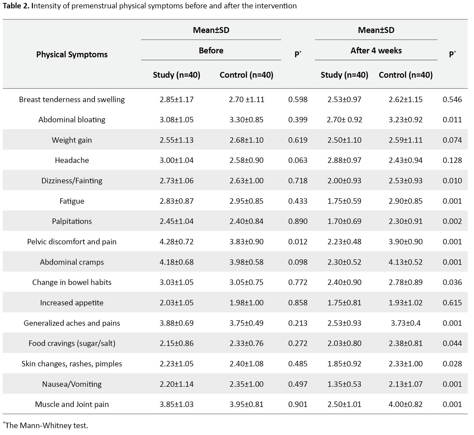 The control group included female students who received routine care such as warm drinks, warm baths, and low salt and fat intake. After 4 weeks, they were interviewed to reassess the severity of PMS symptoms. The intervention group received the intervention plus routine care.