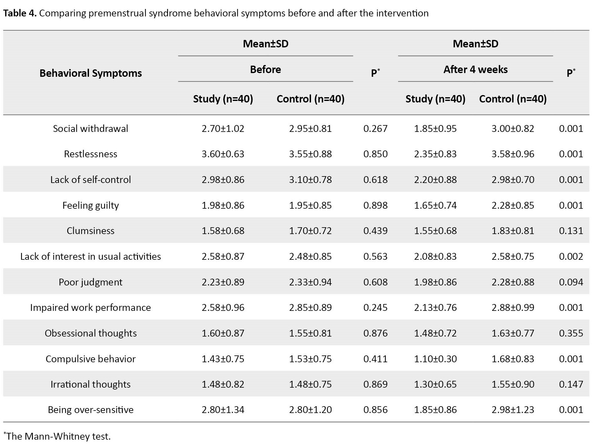 There was no statistically significant difference between the study and control groups in mean intensity scores of all premenstrual behavioral symptoms. On the other hand, after the intervention, there was a statistically significant decrease in mean scores of the intensity of all premenstrual behavioral symptoms between the study and control groups in favor of the study group, except for clumsiness, poor judgment, obsessive and irrational thoughts (