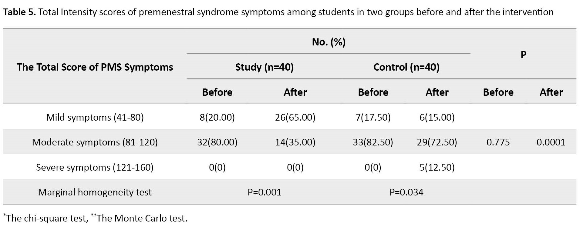It was found that the intensity of PMS symptoms before intervention was moderate among the majority (80% and 82.5%) of the study and control groups, respectively, with no statistically significant difference between the two groups (P=0.775). Meanwhile, after the intervention, about one-third (35%) of the study group still suffered moderate-intensity PMS compared to about three-quarters (72.5%) of the control group. Consequently, the difference between the two groups was statistically significant (P=0.0001). In addition, the intensity of PMS symptoms among the study group was significantly decreased after the intervention (P=0.001). In contrast, the intensity of PMS symptoms among the control group was significantly increased after the intervention (P=0.034). Finally, the intensity of PMS symptoms became severe among 12.5% of the control group after intervention compared to none before intervention (