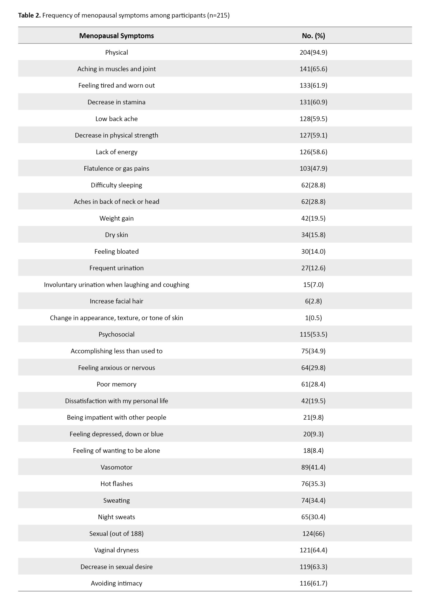 The menopause-related physical symptoms were most prevalent among women (94.9%). More than half of them had experienced physical symptoms such as muscle and joint pain (65.6%), feeling tired or worn out (61.9%), decrease in stamina (60.9%), low back pain (59.5%), decrease in physical strength (59.1%), and lack of energy (58.6%). The menopause-related psychosocial and vasomotor symptoms were prevalent among 53.5% and 41.4% of the participants, respectively. Out of 188 married women, 66% had experienced menopause-related sexual symptoms. Furthermore, among psychosocial symptoms, most of women reported accomplishing less than they used to (34.9%). More than one-third (35.3%) of women had experienced vasomotor symptoms such as hot flashes, sweating (34.4%), and night sweats (30.4%). These results were shown in