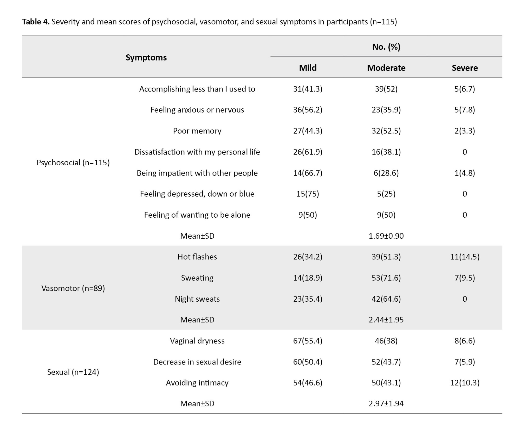 The mean score of the sexual domain (2.97±1.94) was higher than the mean scores of the psychosocial (1.69±0.90) and vasomotor (2.44±1.95) domains. The majority (52.5%) of the women had a moderate level of poor memory, followed by 44.3% with a mild level and 3.3% with a severe level. Severe levels of hot flashes and sweating were reported in 14.5% and 9.5% of the participants. Sexual symptoms such as avoiding intimacy, vaginal dryness and decrease in sexual desire were found to be severe in 10.3%, 6.6%, and 5.9% of the participants, respectively (