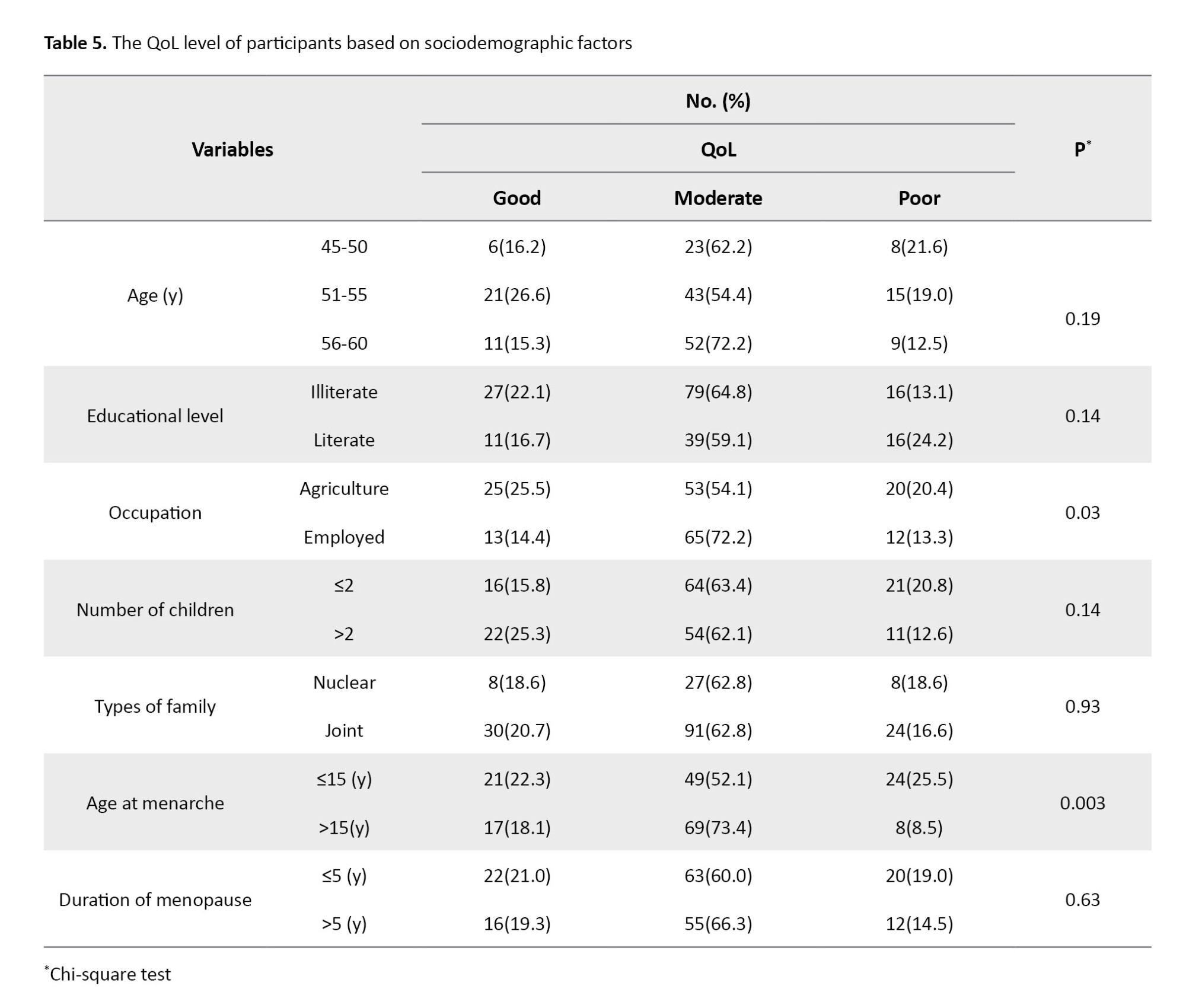Table 5, the level of QoL among postmenopausal women was significantly different based on occupation (P=0.03) and age at menarche (P=0.003).