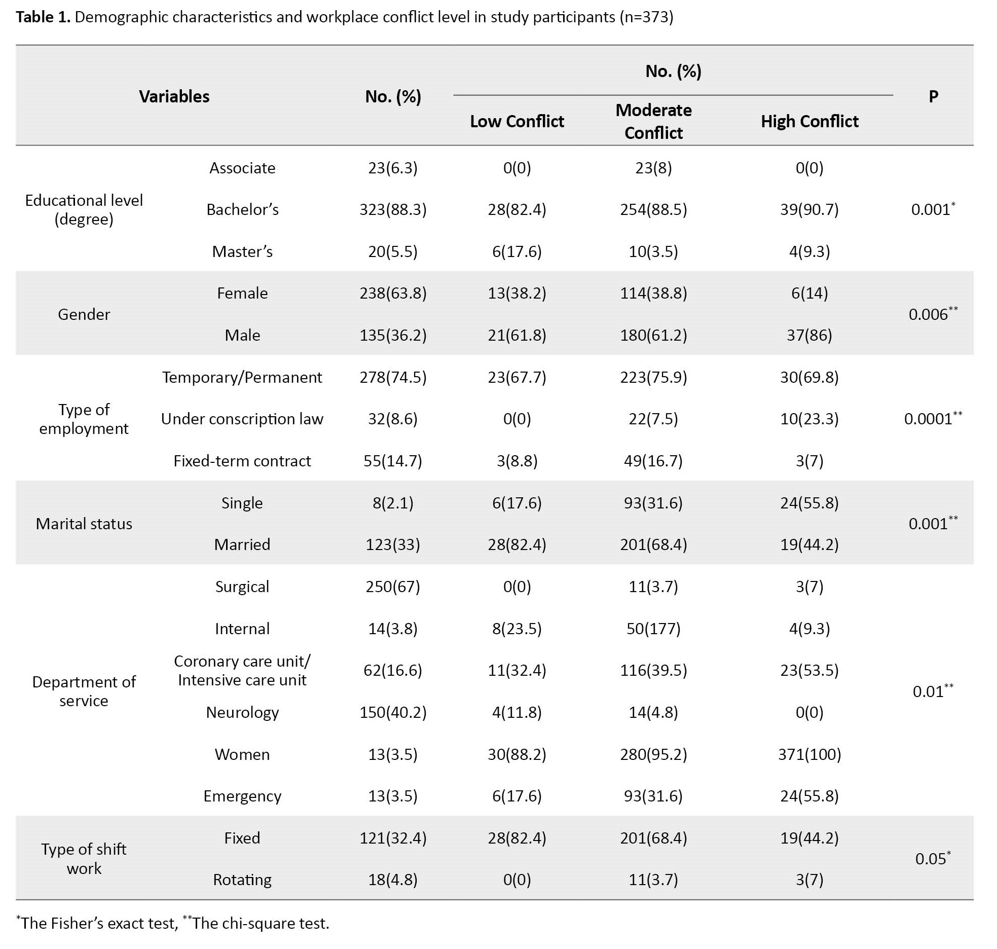 Most participants were female (63.8%) and married (67%), holding a bachelor’s degree (88.3%) with temporary/permanent employment (74.5%). Their mean age was 34.78±5.96 years, and their mean work experience was 9.20±6.11 years. Their WCQ mean score was 10.04±3.93, indicating a moderate level of conflict in nurses. In the high-level conflict group, the highest percentage was related to females (86%) and single (55.8%) nurses with a bachelor’s degree (90.7%), temporary/permanent employment (69.8%), working in a coronary care unit (CCU) or intensive care unit (ICU) (53.5%) and these differences were statistically significant (P<0.05). Although the difference among workplace conflict levels was not statistically significant based on shift work, results showed that 100% of nurses with high-level conflict had rotating shift work (