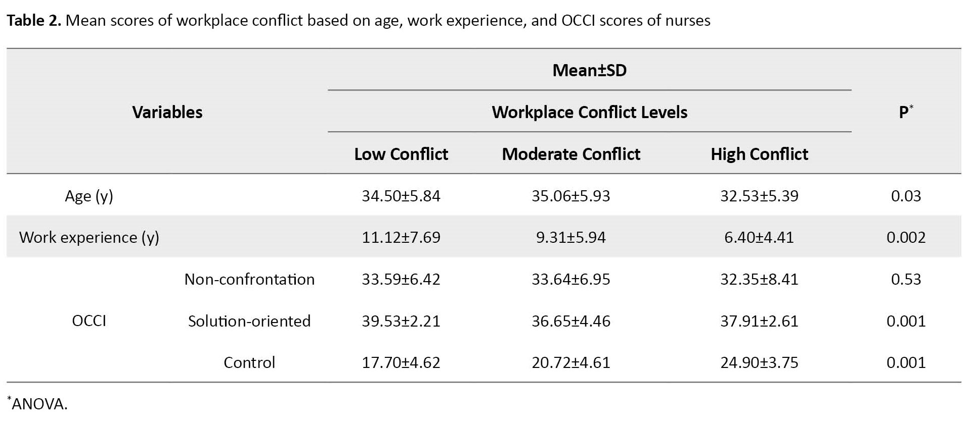 Table 2) that the mean age of the nurses in the high-level conflict group (32.53±5.39 years) was lower than in the moderate-level conflict group (35.06±5.93 years).
