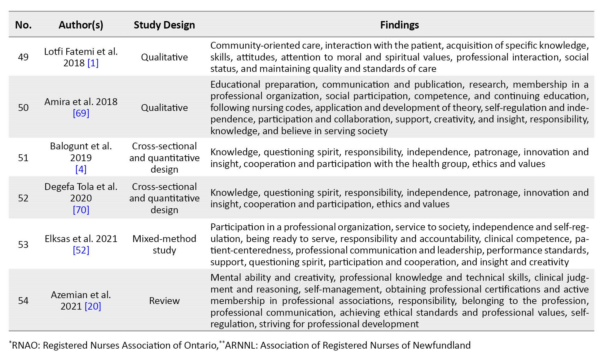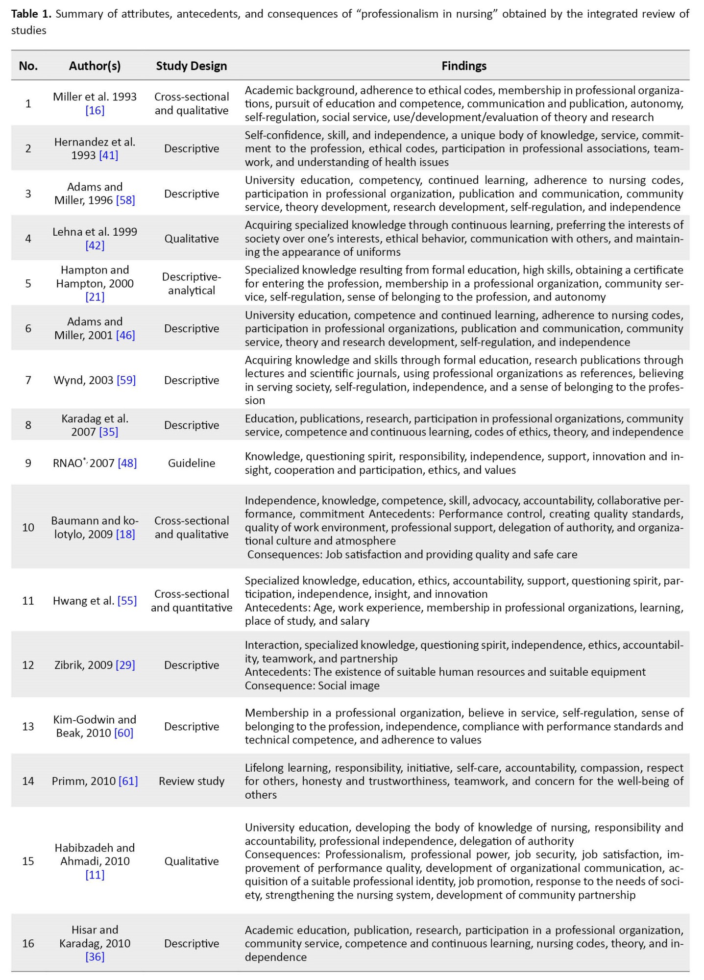 Table 1 details the reviewed studies, including the name of the author(s), year of publication, type of study, definitions, attributes, antecedents, and consequences of the concept of “professionalism in nursing.”
