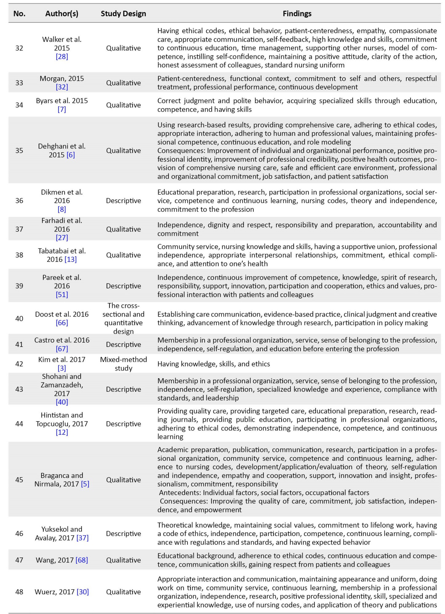 Of these, 47 were articles, 5 were theses, and 2 were guidelines. Regarding study design, 17 used qualitative, 27 employed quantitative, 4 used mixed-method, and 4 were review studies. Most (94%) studies were in English, and the others (6%) were in Persian; 68% were published between 2011 and 2021. The increasing trend of published studies in recent years (35% between 2016 and 2021) indicates the necessity to address the professionalism category from the point of view of nursing scholars.