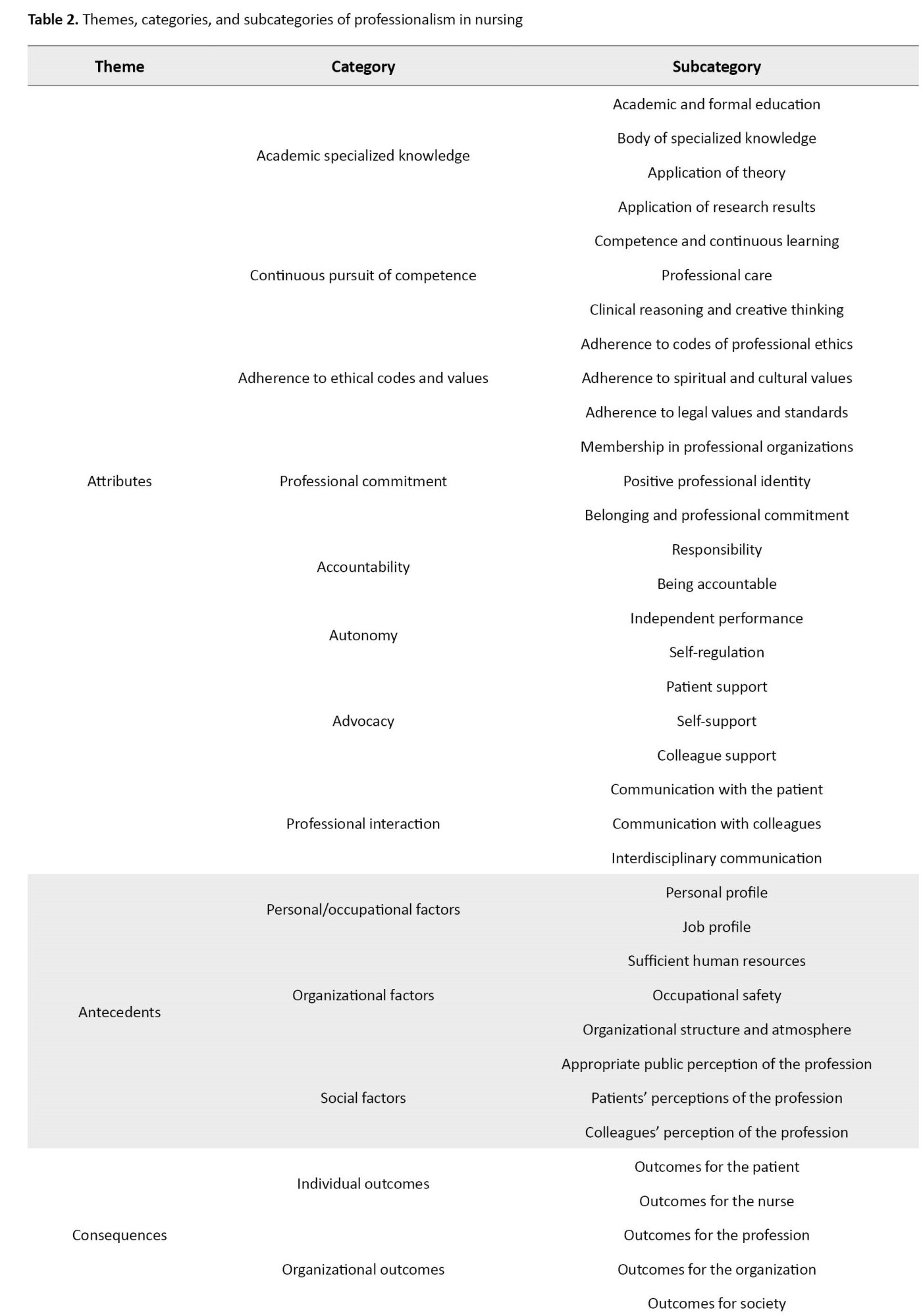 The findings revealed three themes: Attributes, antecedents, and consequences. The theme of attributes included 23 subcategories and 8 categories: Academic specialized knowledge, continuous pursuit of competence, autonomy, professional commitment, professional interaction, accountability, adherence to ethical principles and values, and advocacy. The theme of antecedents had 8 subcategories and 3 categories: Personal, organizational, and social factors. The theme of consequences revealed 5 subcategories and 2 categories: Individual and social outcomes.
