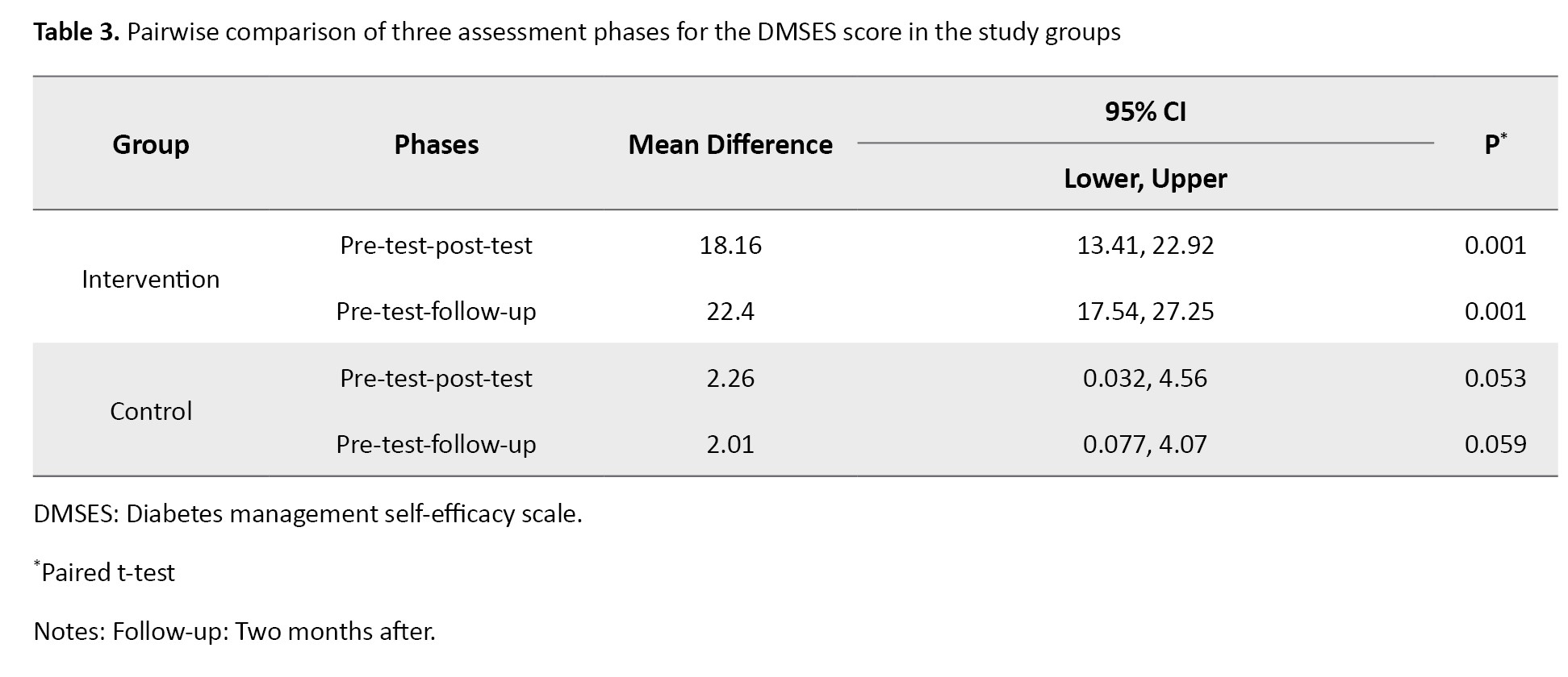 There were a significant difference in the mean DMSES score in the intervention group between pre-test and post-test (P=0.001), and between pre-test and follow-up (P=0.001) phases.