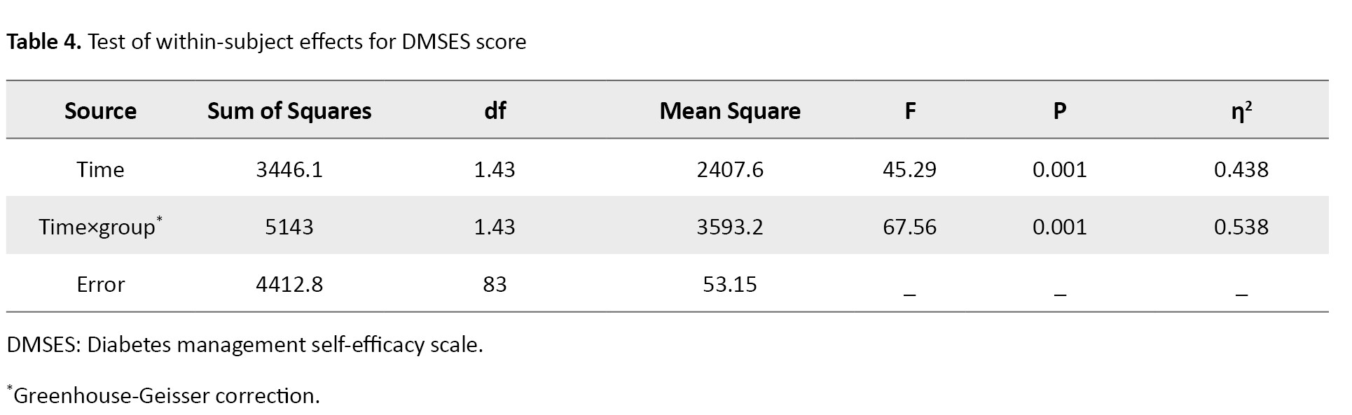 Table 4, the results showed that the effect of time and the interaction effect of time and group were significant (P=0.001).