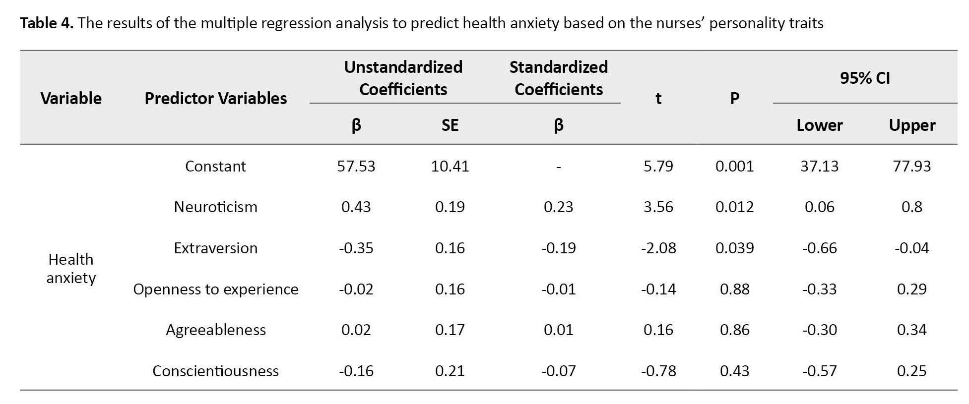 On the other hand, multiple linear regression (simultaneous model) was employed to predict health anxiety based on personality traits. The findings revealed that 7.9% of the variance of health anxiety could be explained by the nurse’s personality traits (F=2.81, R=0.256, R2=0.098, adjusted R2=0.079, P<0.05). However, based on the regression coefficients associated with the role of each personality trait in predicting health anxiety, only the neuroticism and extraversion personality traits were significant predictors (