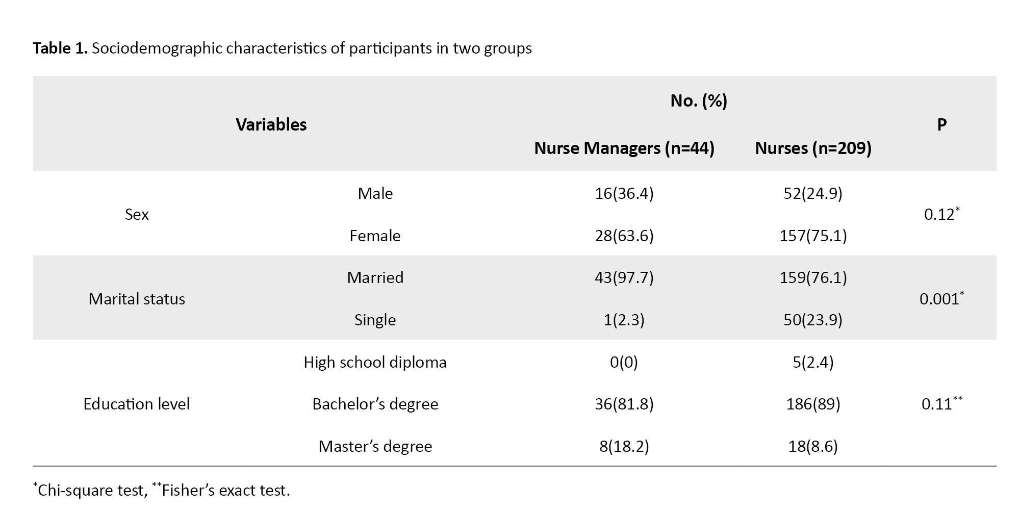 The participants included 44 nurse managers and 209 nurses working in teaching hospitals in Birjand. The mean age of nurse managers and nurses was 44.64±6.00 and 34.22±7.72 years, and their mean work experience was 20.36±7.72 and 10.06±7.72 years, respectively.