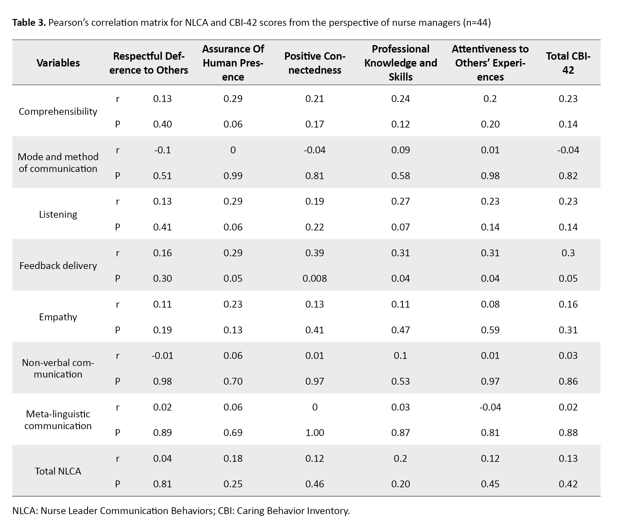 The results of Pearson’s correlation test indicated no significant relationship between the total NLCA and CBI-42 scores according to nurse managers and nurses. According to nurse managers, there was a positive and significant relationship between the feedback delivery domain of NLCA and the total CBI-42 score (r=0.30, P=0.05). No significant relationships were found for other domains of NLCA. The feedback delivery domain of NLCA had a positive relationship with professional knowledge and skills (r=0.31, P=0.04), attentiveness to others’ experiences (r=0.31, P=0.04) and positive connectedness (r=0.39, P=0.008) domains of CBI-42, from the perspective of nurse managers (