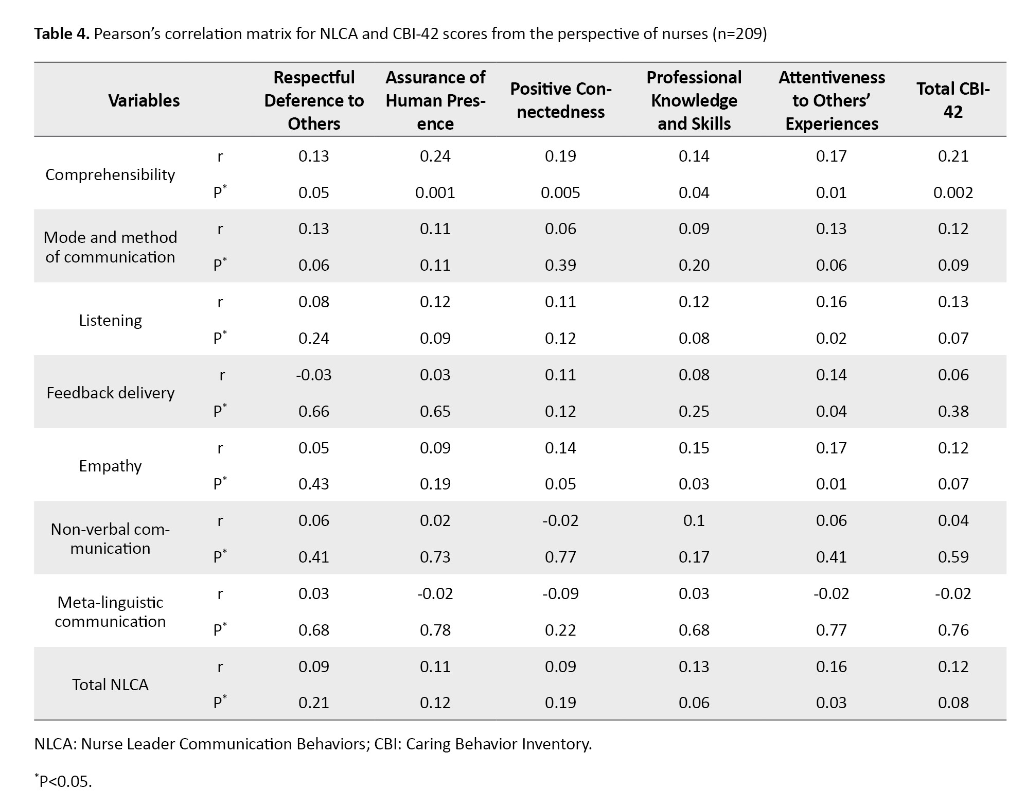 Based on the results of Pearson’s correlation test, according to nurses’ perspectives, there was a positive and significant relationship between the comprehensibility domain of NLCA and total CBI-42 score (r=0.21, P=0.002). Additionally, the attentiveness to others’ experiences domain of CBI-42 had a positive and significant relationship with the listening (r=0.16, P=0.02), feedback delivery (r=0.14, P=0.04), and empathy (r=0.17, P=0.01) domains of NLCA. The professional knowledge and skills domain of CBI-42 had a positive and significant relationship empathy domain of NLCA (r=0.15, P=0.03). No significant relationship was found between the total NLCA score and its other components, and the total CBI-42 score (