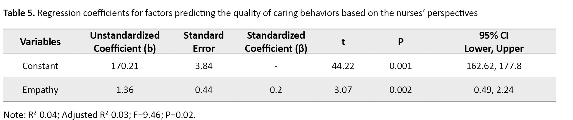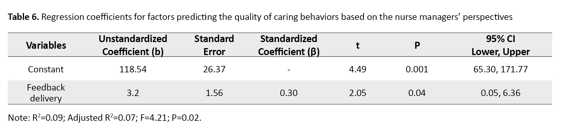 Only the empathy domain could predict the CBI-42 score based on the perspective of nurses (β=0.2, 95% CI; 0.49%, 2.24%, P=0.002). Also, according to the perspective of nurse managers, only the feedback delivery domain could predict the CBI-42 score (β=0.3, 95% CI; 0.05%, 6.36%, P=0.04). This regression model accounted for 7% of the variance in the CBI-42 score (R²=0.07). These results were shown in