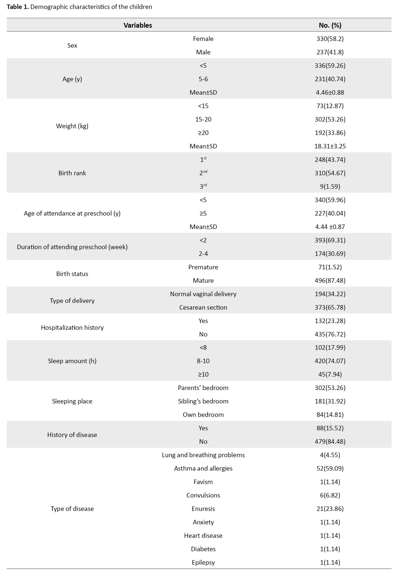 This cross-sectional study was conducted in 2019 in Rasht, north of Iran. The study population includes all parents who enrolled their children in preschools affiliated to the welfare organization of Rasht. Inclusion criteria were: Having a child aged 3-6 years, literacy, being physically and mentally healthy, and enrolling a child in the selected preschool for more than a month. The exclusion criterion was the unwillingness to attend the study. Based on these criteria, 567 eligible parents of children aged 3-6 years participated in the study. The sample size was determined according to the mean SAD score (71.87±9.9) reported by Talaienejad et al. [