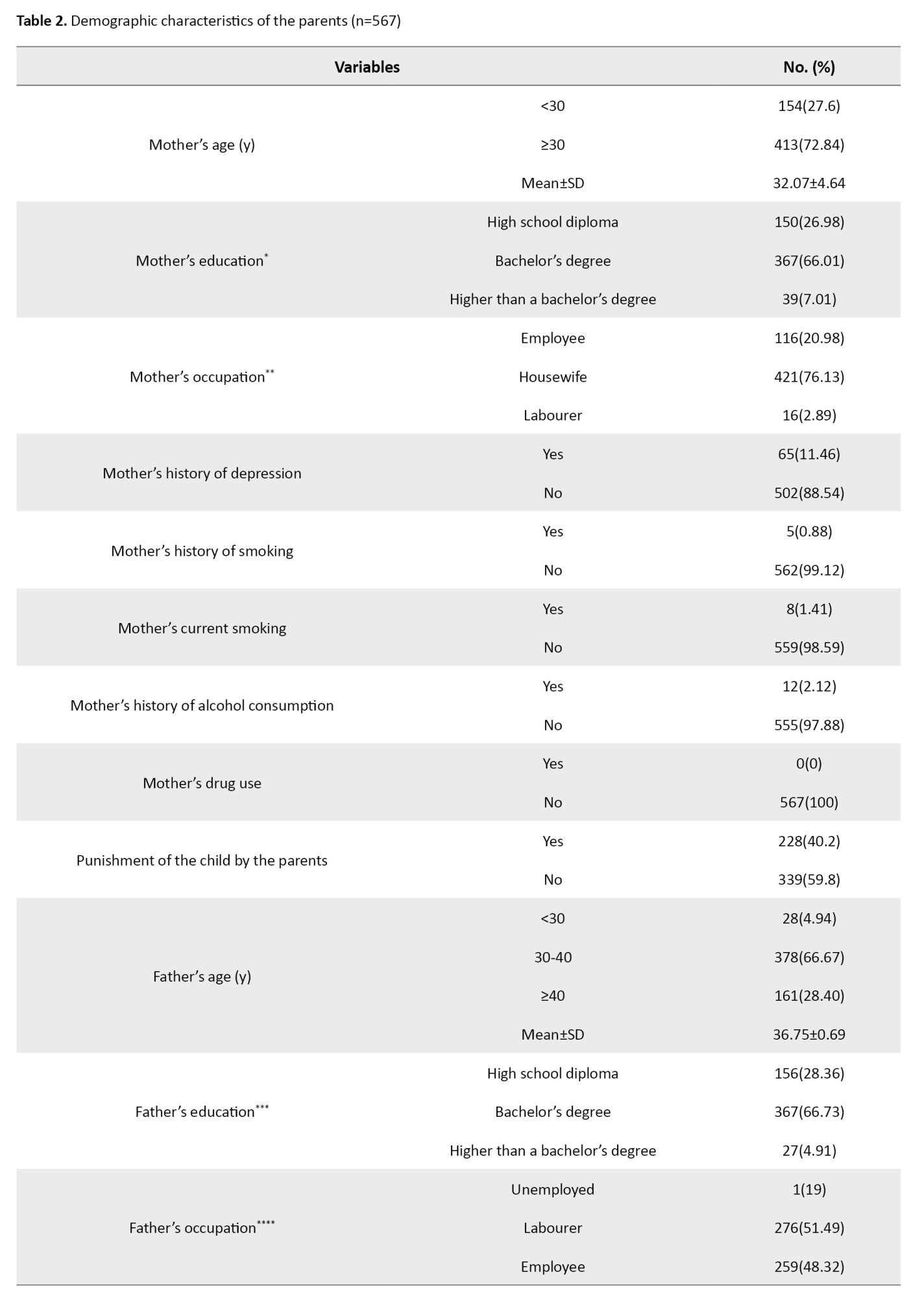 One of the limitations of the present study was the selection of 3-6 year old children and not considering children with younger ages. Therefore, caution should be exercised in generalizing these findings to all age groups of children. It is recommended that a more extensive study be conducted on children below this age range. Another limitation was the existence of missing data for some characteristics of parents.