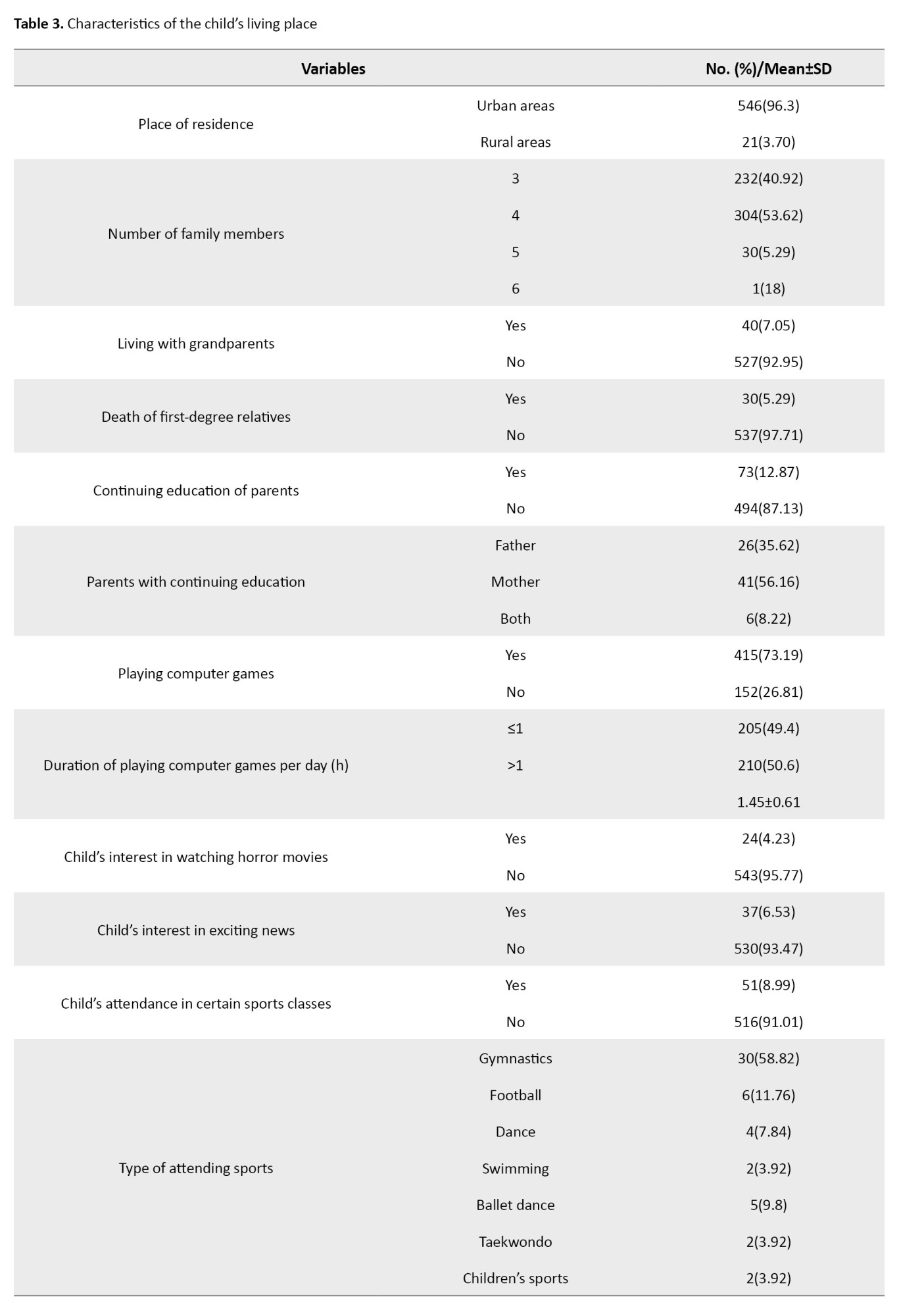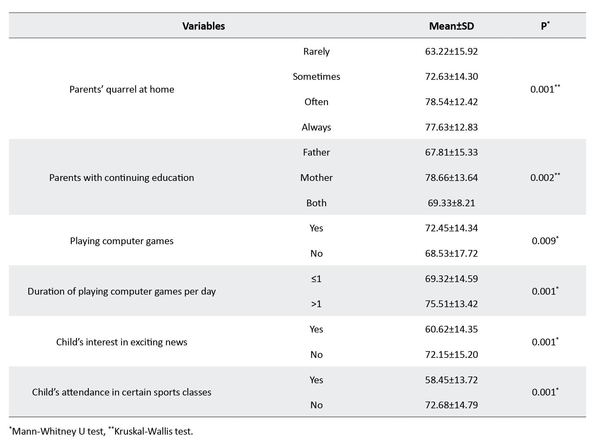 The results of Friedman’s test showed a statistically significant difference in the scores of separation anxiety based on the characteristics of children, parents, and living place (P=0.001). The results in