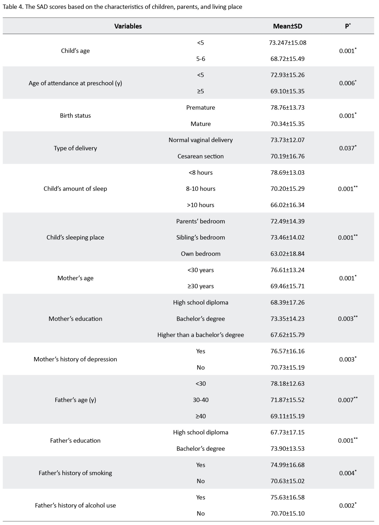 Table 4 showed that the separation anxiety score was significantly different based on the child age (P=0.001), age at preschool attendance (P=0.006), birth status (P=0.001), type of delivery (P=0.037), amount of sleep (P=0.001), place of sleep (P=0.001), mother’s age (P=0.001), mother’s education (P=0.001), mother’s history of depression (P=0.003), father’s age (P=0.007), father’s education (P=0.001), father’s history of smoking (P=0.004), father’s history of alcohol consumption (P=0.002), parents’ quarrel at home (P=0.001), continuing education of parents (P=0.002), playing computer games (P=0.009), duration of playing computer games per day (P=0.001), the child’s interest in exciting news (P=0.001) and the child’s attendance in certain sports classes (P=0.001).