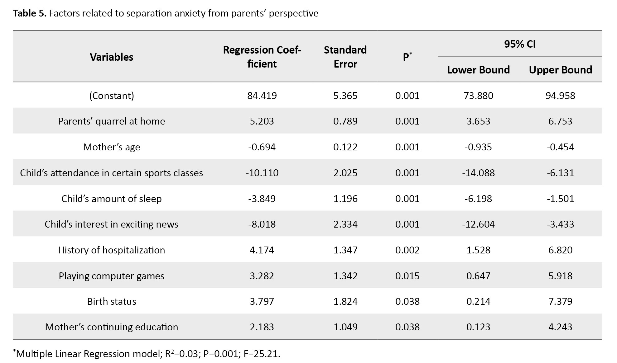 Table 5) showed that the following factors were the predictors of increasing separation anxiety in children: Parents’ quarrel at home (β=5.203, 95% CI; 3.653%, 6.753%, P=0.001), history of hospitalization (β=4.174, 95% CI; 1.528%, 6.820%, P=0.002), playing computer games (β=3.282, 95% CI; 0.647%, 5.918%, P=0.015), premature birth (β=3.797, 95% CI; 0.214%, 7.379%, P=0.038) and mother’s continuing education (β=2.183, 95% CI; 0.123%, 4.243%, P=0.038).