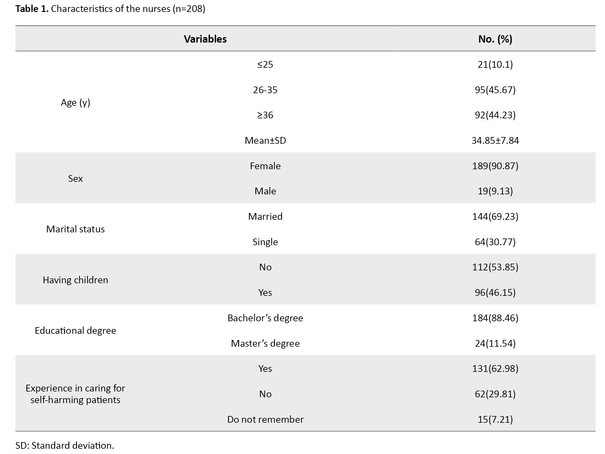 The mean age of the participants was 34.8±7.8 years. The majority of them were female (90.9%) and married (69.2%). Also, 46.2% had children. The majority (88.5%) had a bachelor’s degree, while only 11.5% had a master’s degree. Most of the nurses (63%) had experience in caring for self-harming adolescents (