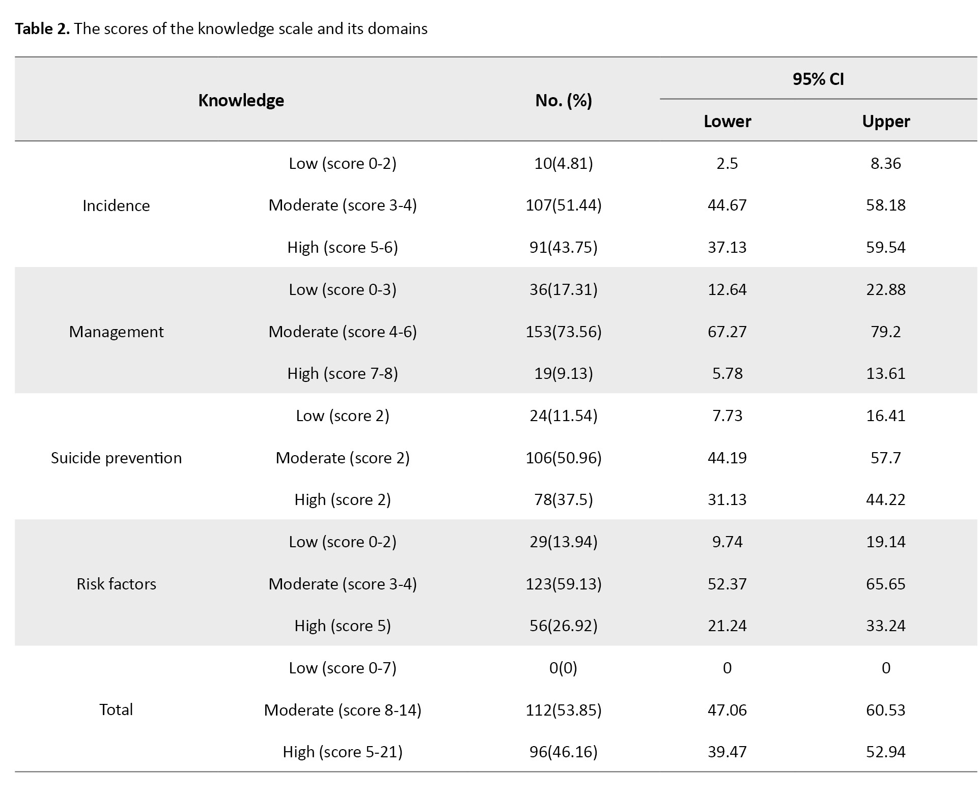 None of the nurses had a low knowledge. Regarding the domains of the knowledge scale, the highest level was for the incidence domain (43.7%), followed by suicide prevention (37.5%), risk factors (26.9%), and management (9.13%). According to