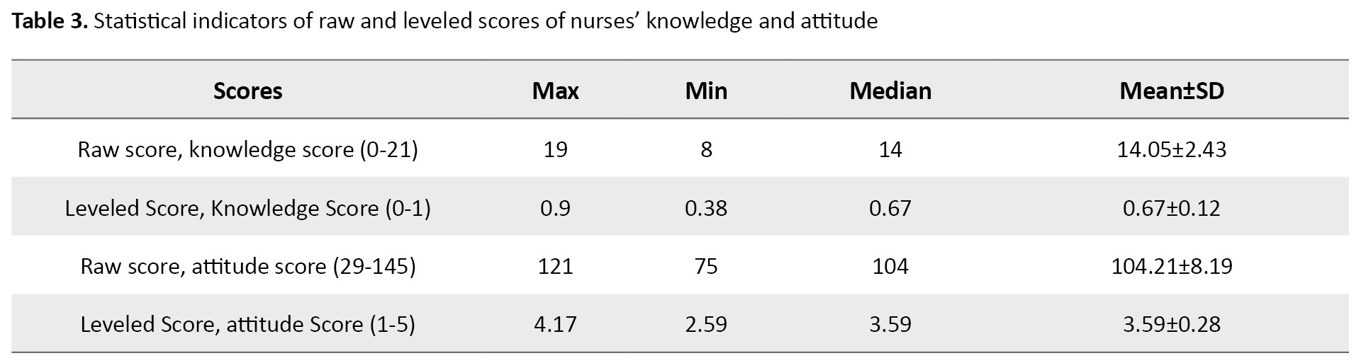 Table 3, The nurses’ knowledge score in the knowledge of care from the range of 0-21 possible scores was equal to (14.05±2.43), the lowest score obtained was 8 and the highest was 19.