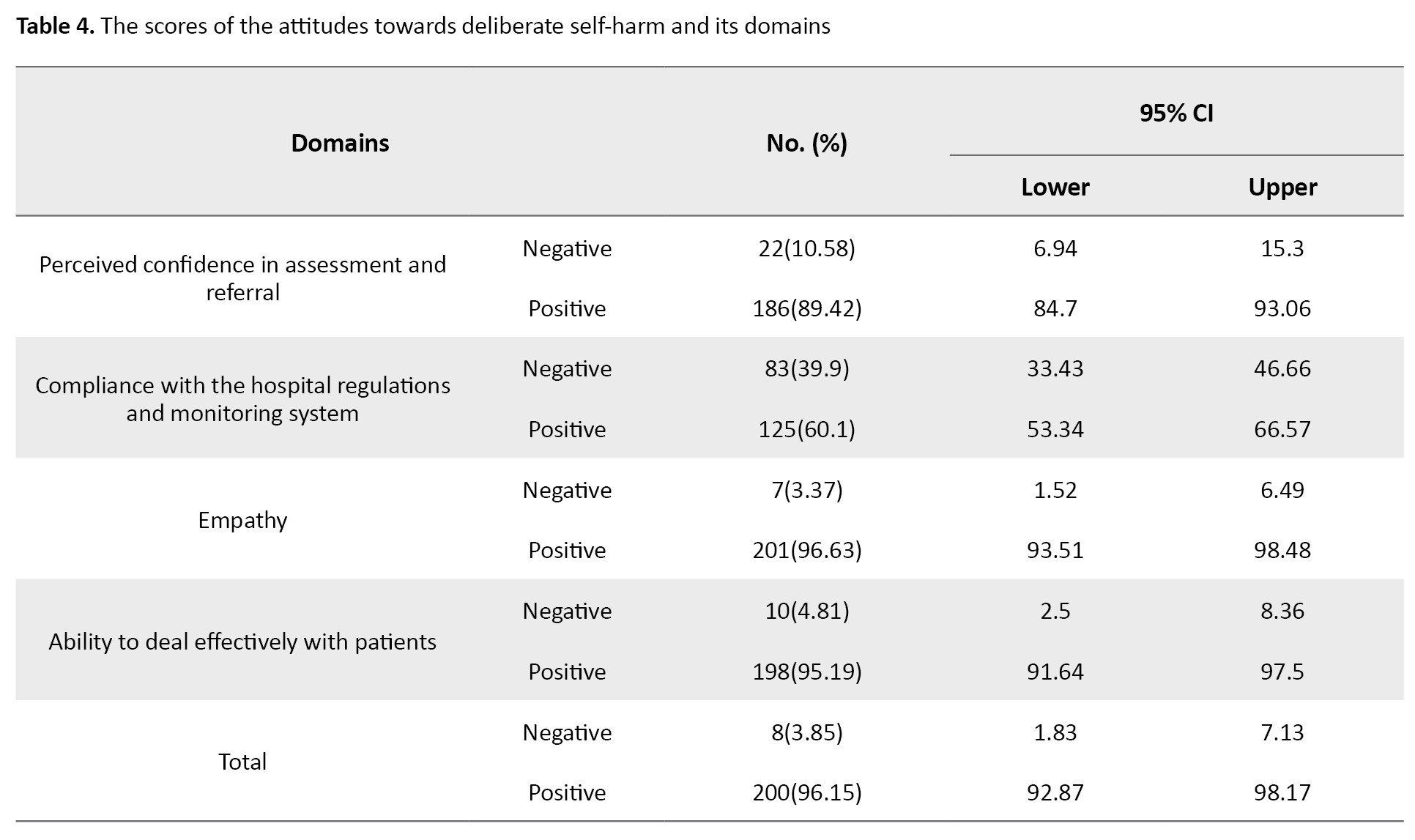 Table 4, 96.2% of the nurses had a positive attitude towards the care for self-harming adolescents, where the highest positive attitude level was for the empathy (96.6%) and effective dealing (95.2%) domains and the lowest score was for the compliance with hospital regulations domain (60.1%).