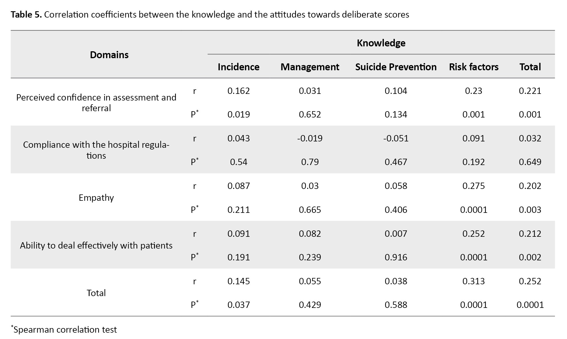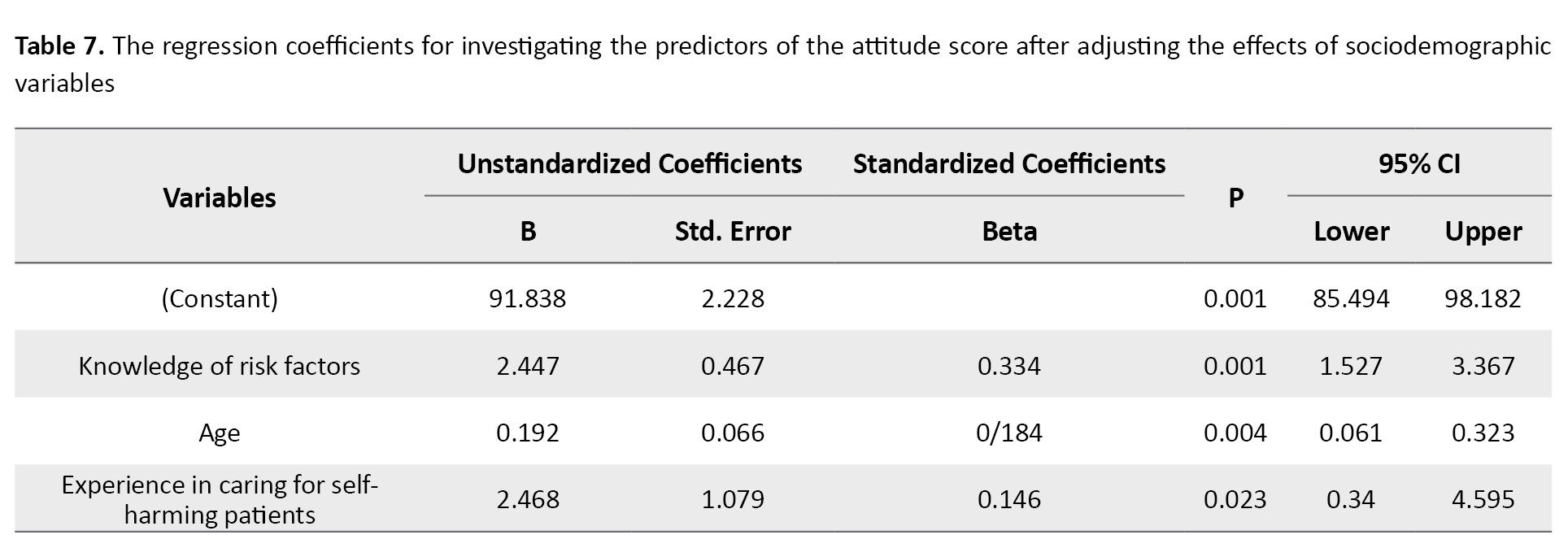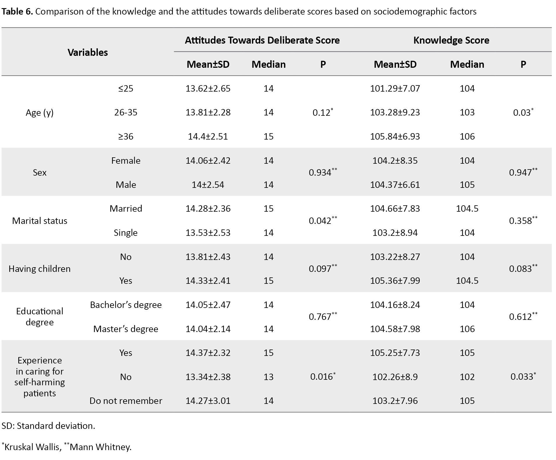 Table 6, the knowledge score was significantly different based on nurses’ marital status (P=0.042) and experience in caring for self-harming adolescents (P=0.016).