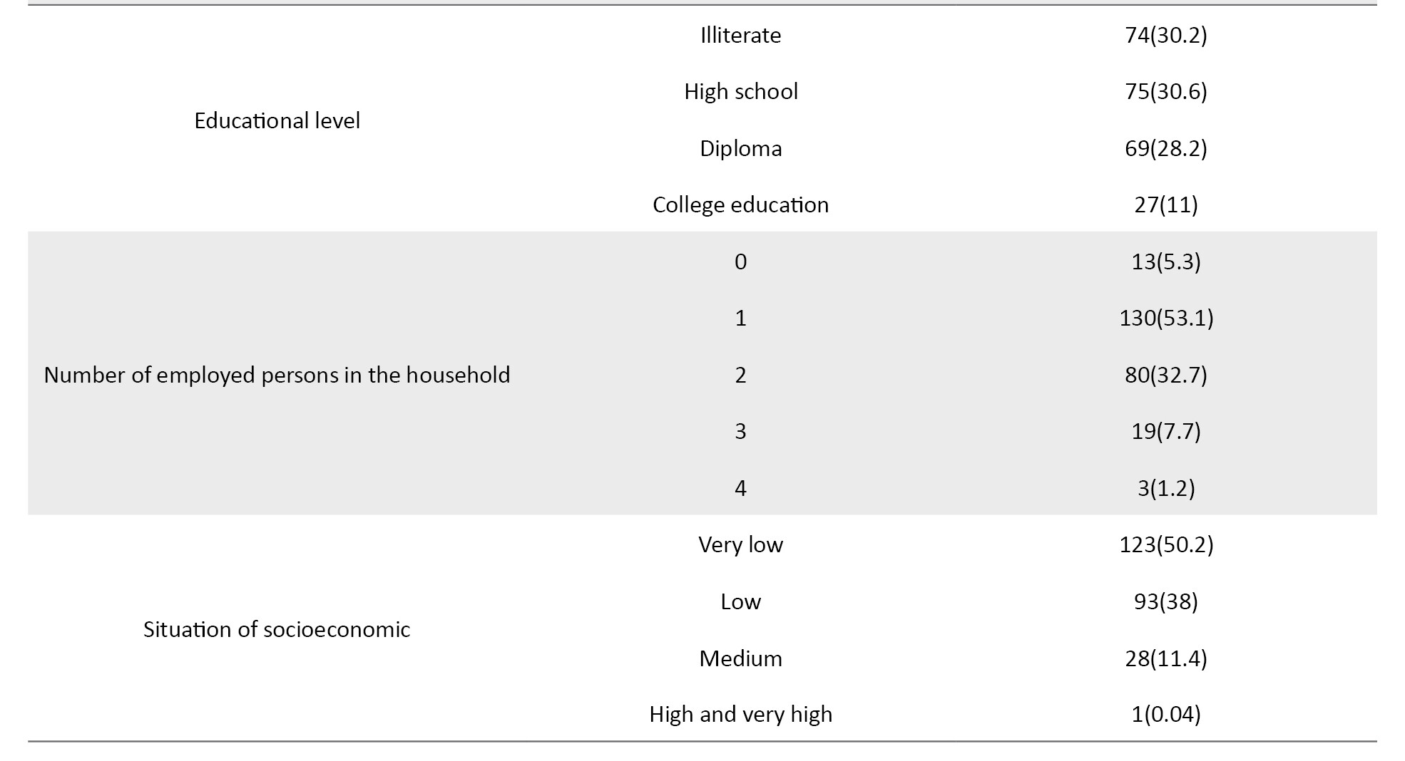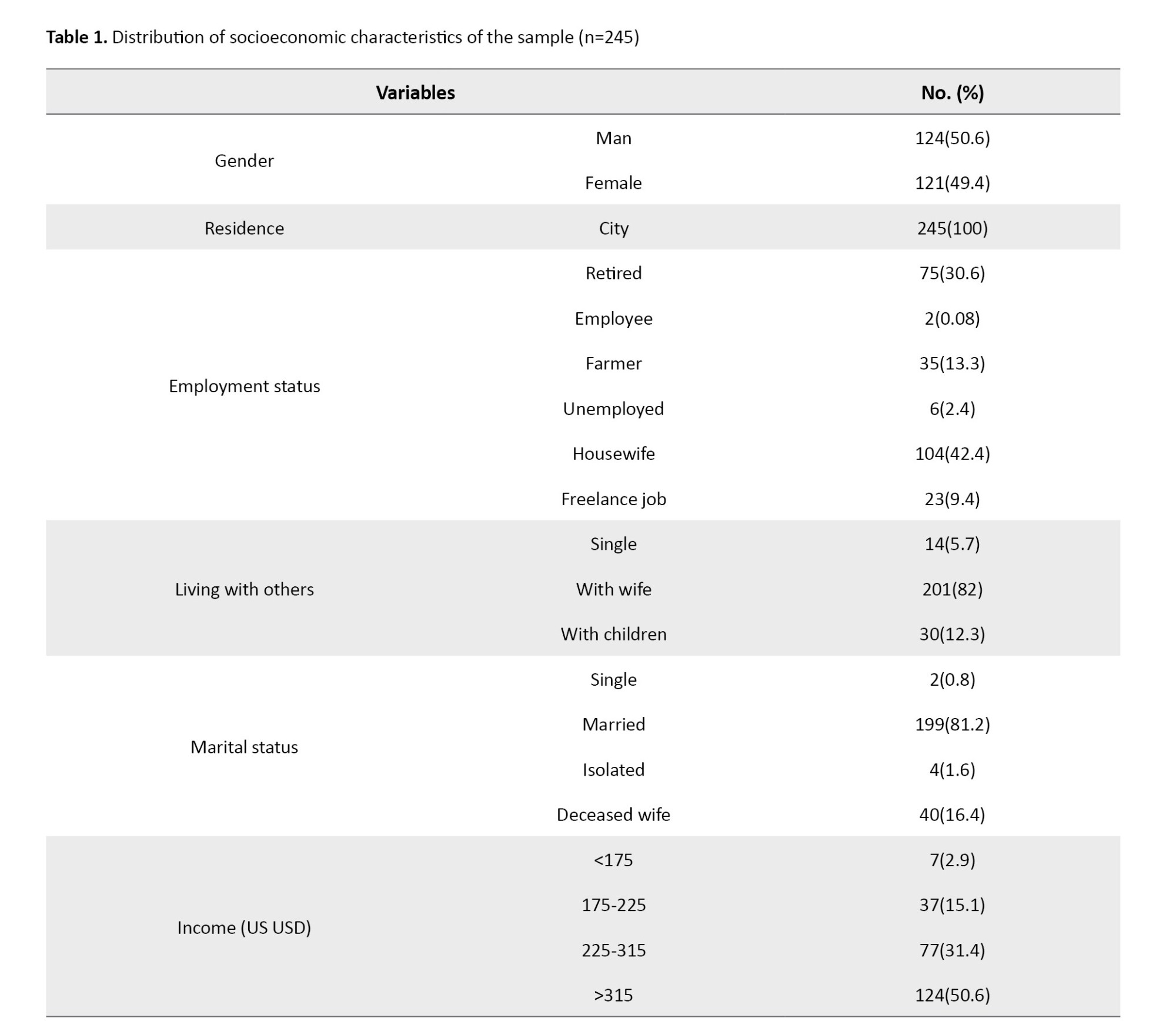 Two hundred forty-five older people, all of whom had an AMT score greater than 7, were included in the study. The sample consisted of 50.6% males and 49.4% females. The mean age of the samples was 67.66±6.059 years, and all were residents of the town. The occupational status of most people was as follows: 42.4% of households, 82% lived with their spouses, 81.2% were married, 50.6% had incomes above 315 USD, and 30.6% had a level of education below a diploma. About 61.2% had an underlying disease; most of them, 25.7%, had four children. In most households, 53.1% had at least one employed family member, and 34.3% had three or more people living together. Table 1 provides demographic information.