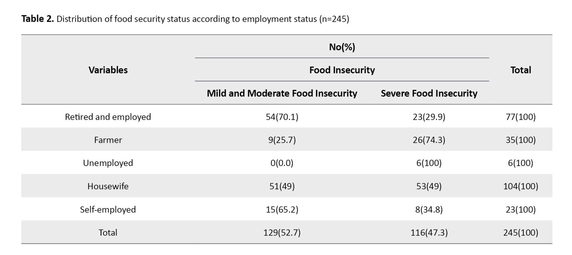 For statistical analysis, descriptive statistics were employed, and descriptive indicators such as Mean±SD, and univariate chi-square tests were utilized. The simultaneous effect of independent variables on severe food insecurity was shown through multiple logistic regression. Data analysis was performed using SPSS software, version 16.