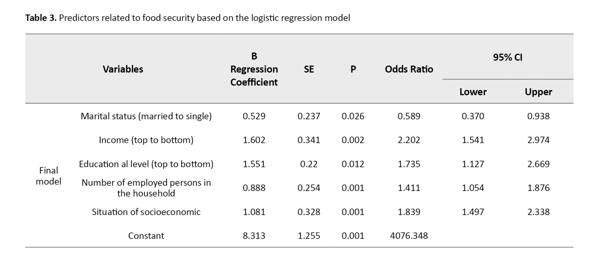 The results indicate that, at a 95% Confidence Level (CI), the relationships between food security and job status, marital status, living with others, income, education, the number of family employees, and the number of people living together are statistically significant. However, the relationship between food insecurity and gender, underlying disease, and number of children is not significant. A significant relationship exists between SES and an individual’s food security (P=0.01). The mean food insecurity index is 14.37±5.123. At a 95% confidence level, the relationship between food security and situation of socioeconomic (OR=1.839, 95% CI, 1.497, 2.338, P=0.001), marital status (OR=0.589, 95% CI, 370,0.938, P=0.001), income (OR=2.202, 95% CI, 1.541, 2.974, P=0.001), education (OR=1.735, 95% CI, 1.127, 2.669, P=0.001), the number of family workers(OR=1.411, 95% CI, 1.054, 1.876, P=0.001) were significant.
