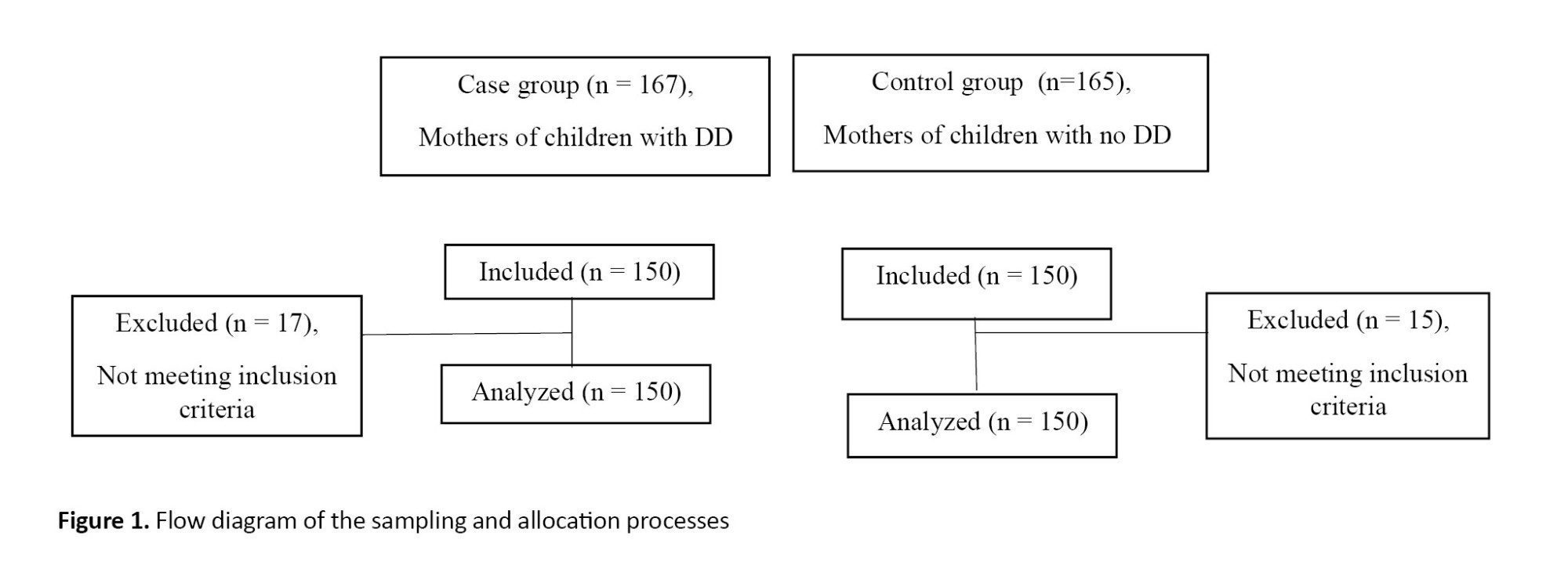 This case-control study was conducted from January to August 2022. The case group included mothers of children diagnosed with DD by a pediatrician in the Comprehensive Development Center in Tabriz, Iran. They were selected via convenience sampling. The control group included mothers of children under five years without DD, referred to health centers in Tabriz. They were selected via cluster sampling and the simple random sampling method using the Random Website [25]. First, a quarter (20 centers) of the 80 health centers in Tabriz were randomly selected. From each center, participants were randomly selected using a computer program and based on the determined sample size. The appropriate sample size for each selected center was calculated as a fraction of the total sample size, according to the demographics of the center. The researcher contacted the parents by phone to briefly explain the study objectives and methodology to them and invite them. Considering that most study variables were related to children’s characteristics (15 items) and that 10 samples were accounted for per item [26], the sample size was estimated at 150 per group. The inclusion criterion was having a child under five years. Children with congenital abnormalities or intellectual disability were excluded. The outcome was DD and exposures included socio-demographic variables. Matching was conducted based on the children’s ages in both groups. Each case was matched with one control, resulting in a 1:1 ratio.