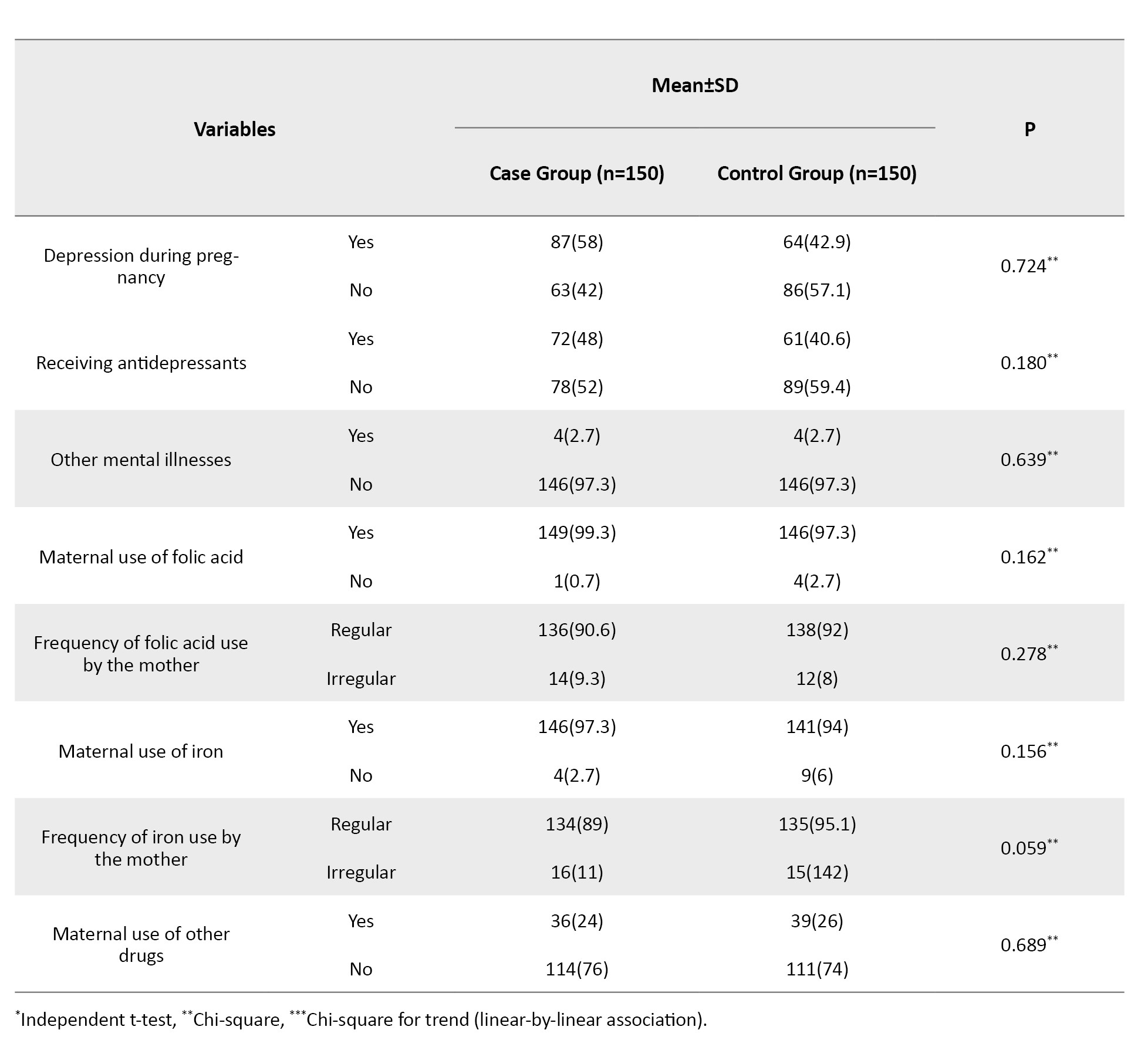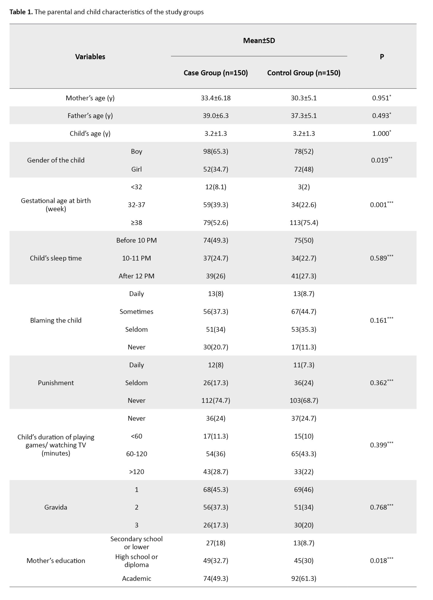 In total, 300 mothers with children aged under five years in two equal case and control groups were assessed. The mean age of mothers was 33.4±6.2 years in the case group and 30.3±5.1 years in the control group. Male children comprised 65.3% of the case group and 52% of the control group. Most mothers in both groups were housewives (86.7% in the case group and 76.0% in the control group), and the majority had an academic education (49.3% in the case group and 61.3% in the control group).