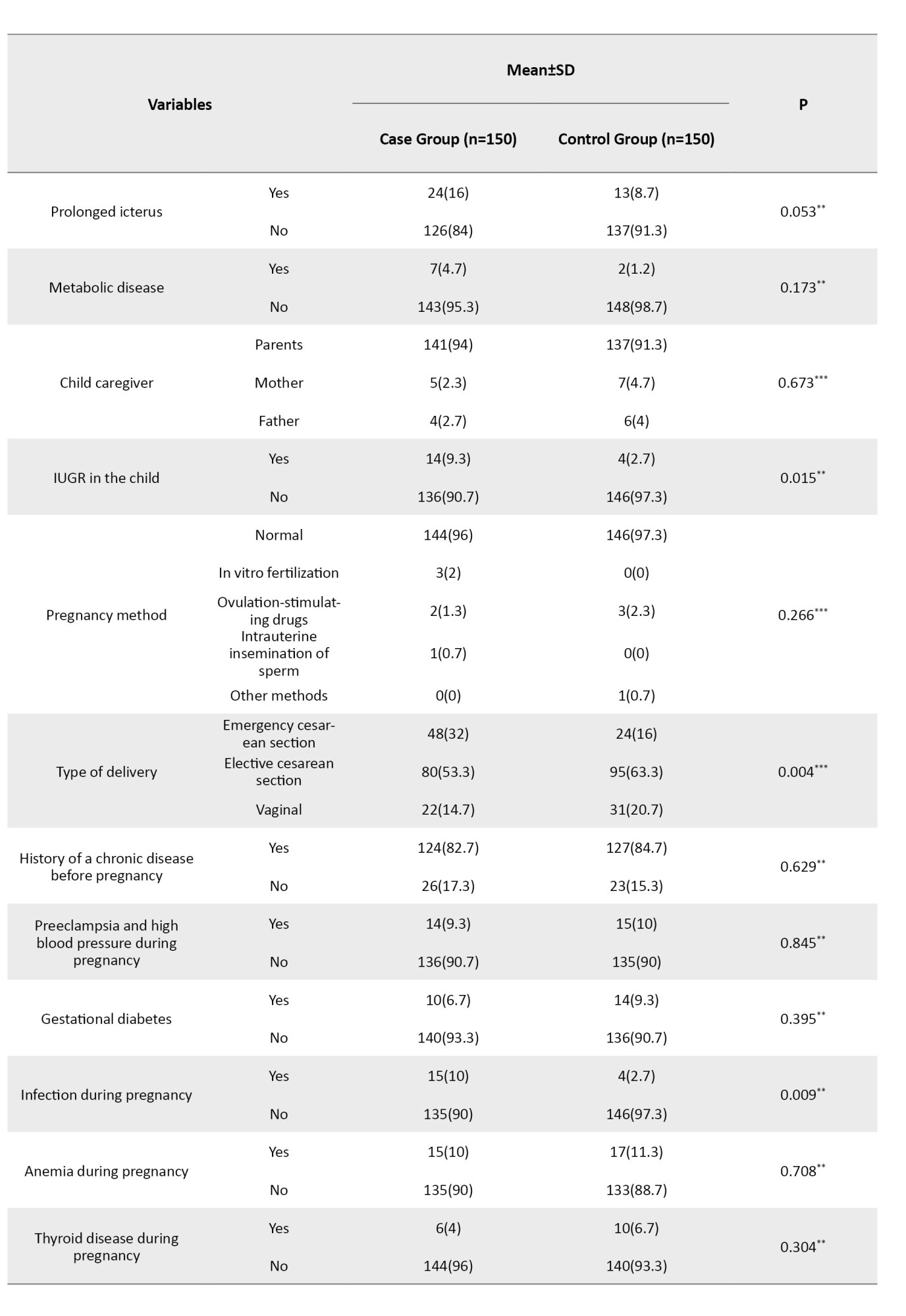 The data collection instrument was a researcher-made questionnaire surveying sociodemographic/clinical/ obstetric characteristics of the mothers and the characteristics of their children. The questionnaire was reviewed and confirmed based on the opinions of a panel of experts, including pediatricians and developmental specialists. Socio-demographic characteristics included parents’ age and educational level, family’s monthly income, mother’s occupation, type of marriage, and parents’ history of tobacco and hookah use. Clinical/obstetric characteristics included gravida, pregnancy method, type of delivery, history of chronic diseases before pregnancy, history of disorders during pregnancy (pre-eclampsia or high blood pressure, gestational diabetes, anemia, thyroid disease, depression, and receiving medication for them), and maternal use of iron, folic acid, and other drugs. Child-related characteristics included gender and age of the child, gestational age at birth, IUGR in the child, wanted/unwanted child, use of iron, multivitamin or A+D drops by the child, breastfeeding the child, reading books to the child, child sleep time, child play time, blaming or punishment of the child, and history of prolonged icterus, metabolic diseases, and hospitalization.