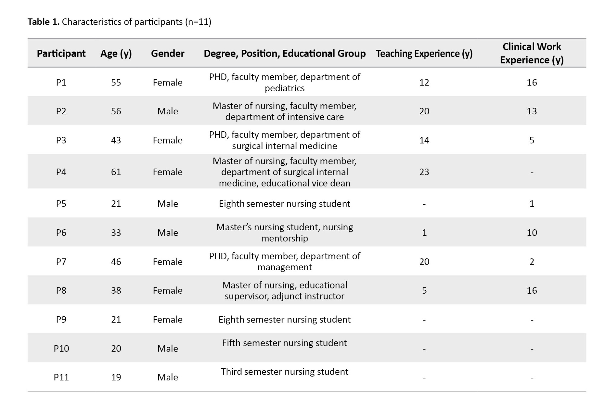 Data saturation was achieved with 11 participants (5 men and 6 women; mean age: 37.54 3.5 years). Participants included nursing faculties, educational supervisors, and undergraduate/graduate students with diverse clinical experience and academic roles. Additional participant characteristics, including work experience, position, and academic department, are presented in Table 1.
