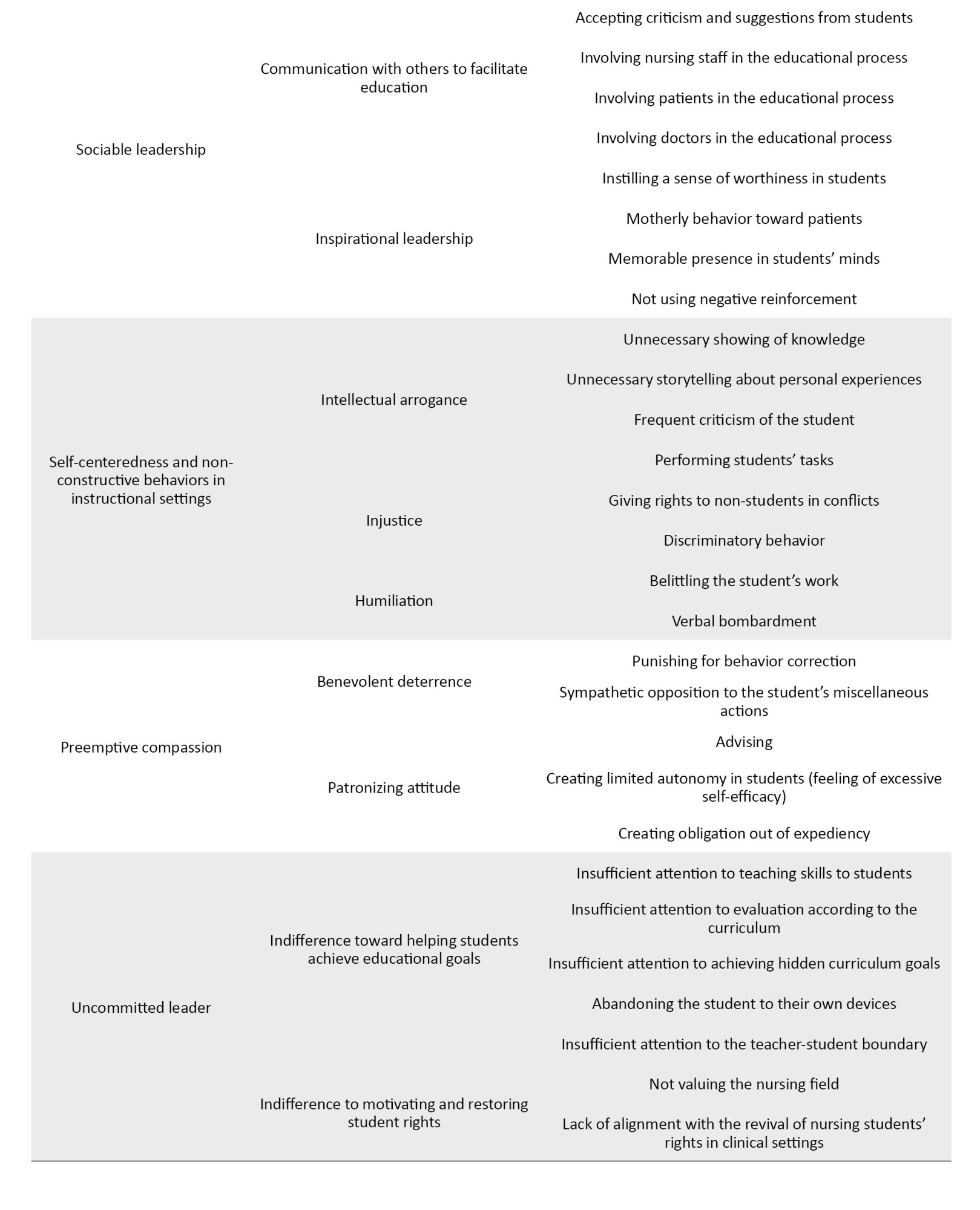 The “uncommitted leadership” was another category, and its subcategories consisted of “indifference towards helping students achieve educational goals” and “indifference to motivating and restoring student rights.”