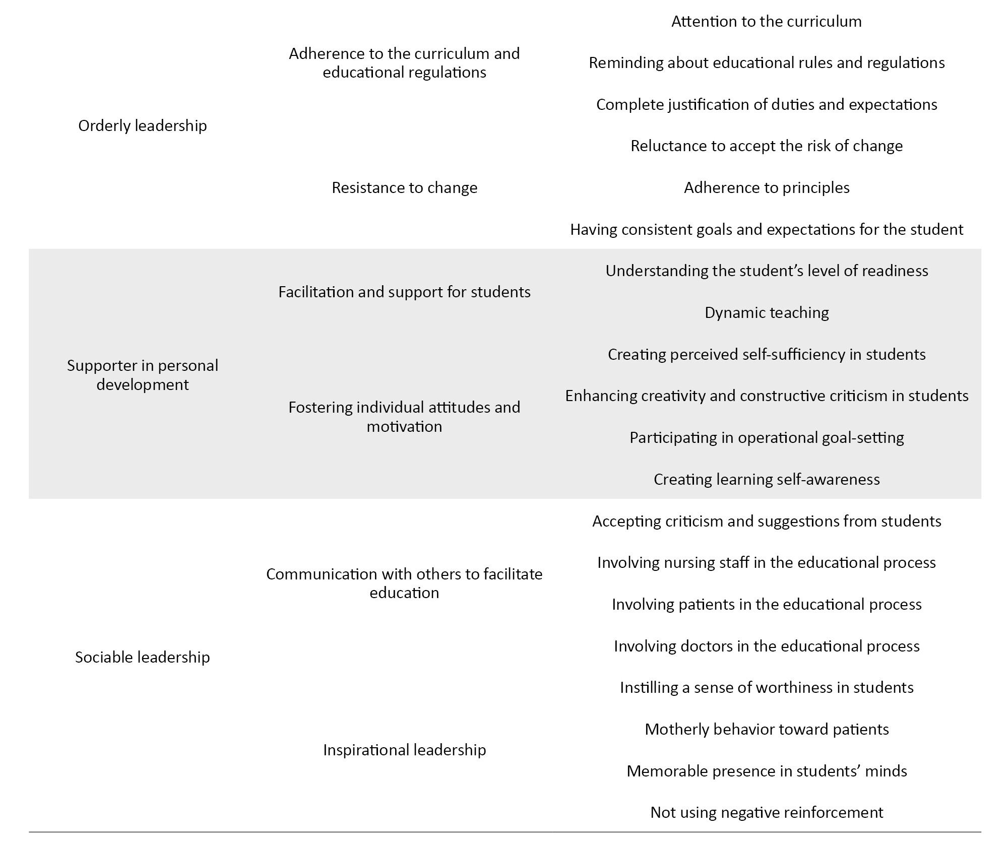 It consists of “communication with others to facilitate education” and “inspirational leadership is its subcategories.”
