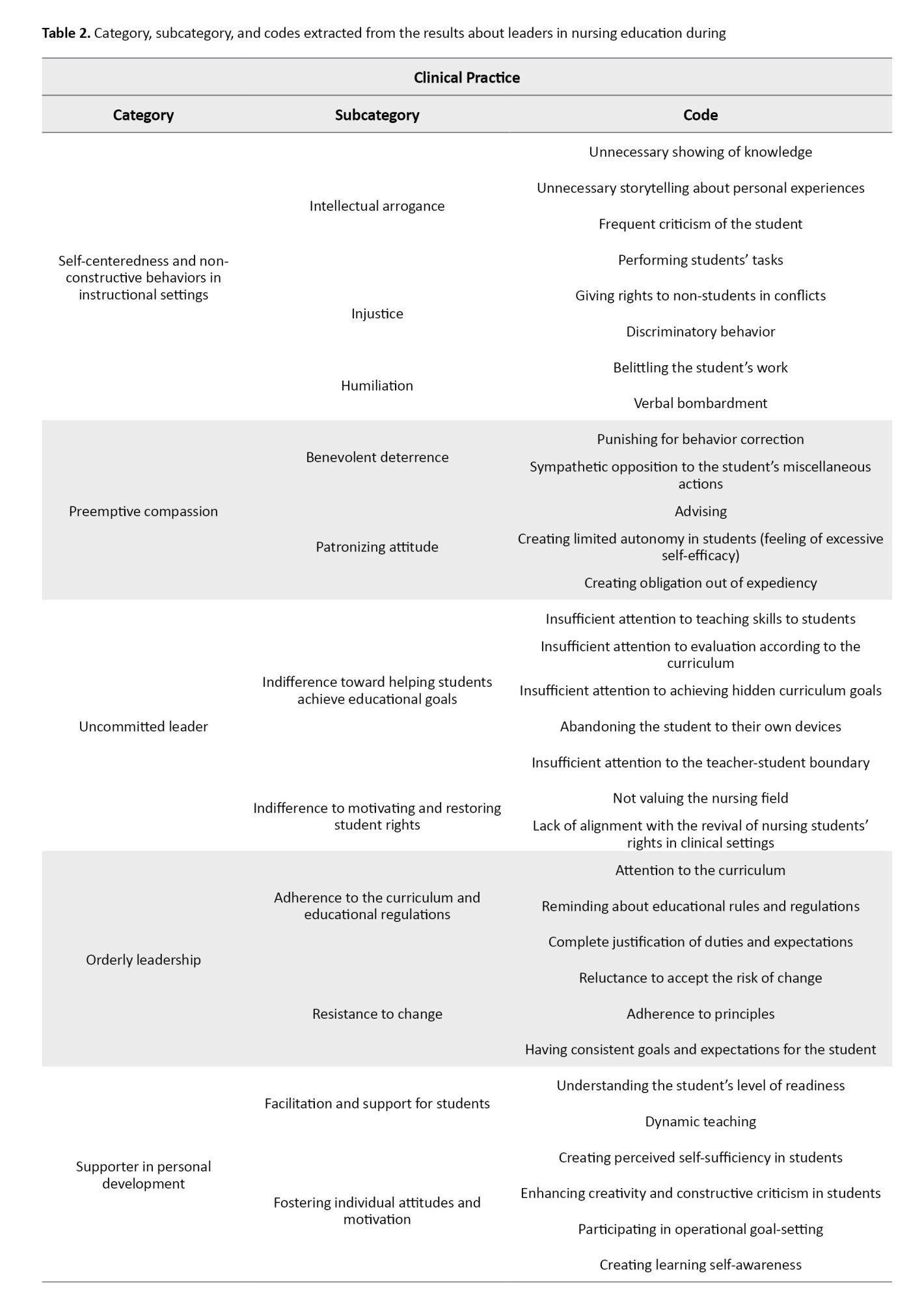 To ensure credibility and trustworthiness, several strategies were employed. Member checking was implemented, where participants reviewed preliminary findings for accuracy. Data triangulation was used by incorporating interviews, observations, and field notes, strengthening the consistency and depth of the findings. Peer review by qualitative research experts validated the methodology, ensuring adherence to standards. The data collection and analysis process were meticulously documented, maintaining an audit trail for transparency and verification of decisions. These strategies enhanced the reliability, validity, and depth of the study, providing a nuanced understanding of educational leadership in clinical nursing practice [16]. Data analyses was done by MAXQDA software, version 2020.