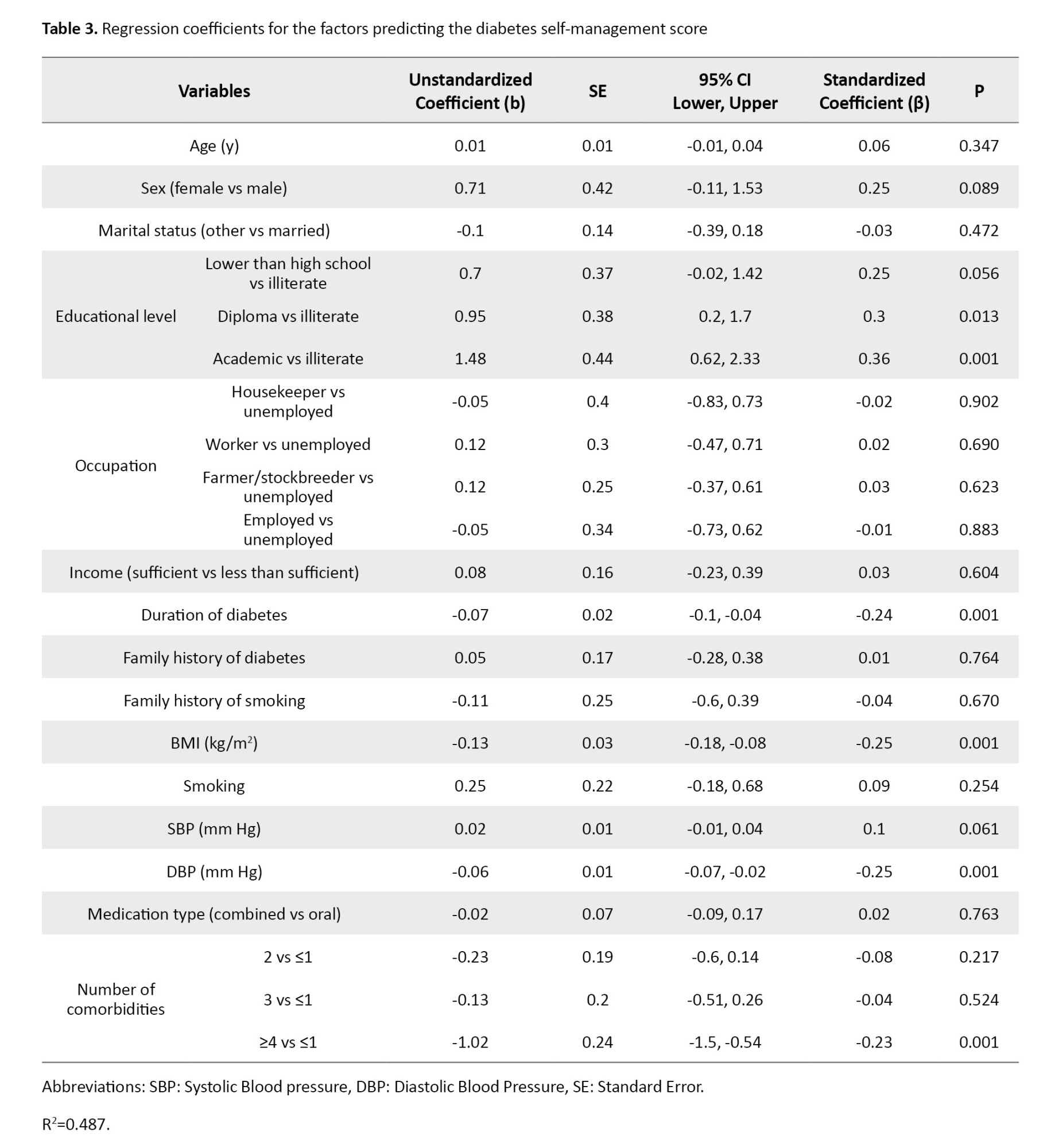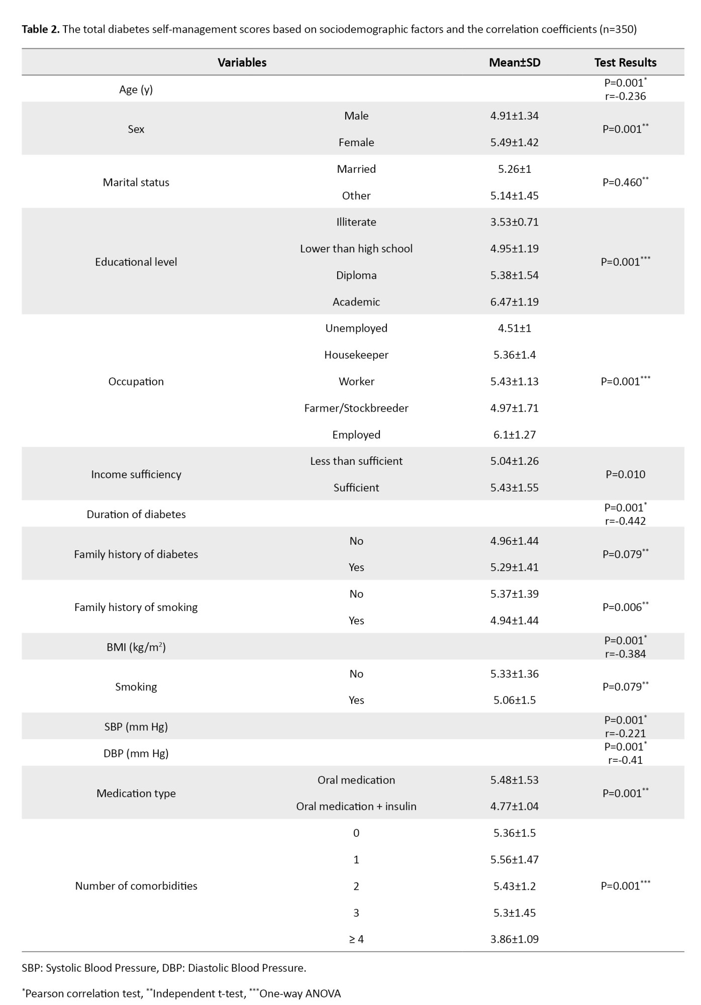 The total mean DSMQ-R score was 5.23±1.42. There was a significant difference in the mean scores of the DSMQ-R domains based on the independent t-test results. The glucose monitoring domain had a score higher than that of other domains (5.99±1.57, P=0.001). The mean scores for eating behavior (5.28±2.05) and cooperation with the diabetes team (5.35±1.55) domains were significantly higher than that of the physical activity domain (3.87±2.06) (P=0.001). The total DSMQ-R score had a significant negative correlation with age (r=-0.23, P=0.001), diabetes duration (r=-0.44, P=0.001), BMI (r=-0.38, P=0.001), systolic blood pressure (r=-0.22, P=0.001), and diastolic blood pressure (r=-0.41, P=0.001) according to the Pearson correlation test results. According to independent t-test results, there were significant differences in total DSMQ-R score based on sex and type of medication (P=0.001), where the scores were higher in females than in males, and lower in those using insulin plus oral medications than in those using only oral medications (P=0.001). Significant differences in total DSMQ-R scores were also observed based on education level (P=0.001) and number of comorbidities (P=0.001), according to one-way ANOVA results. These results were shown in