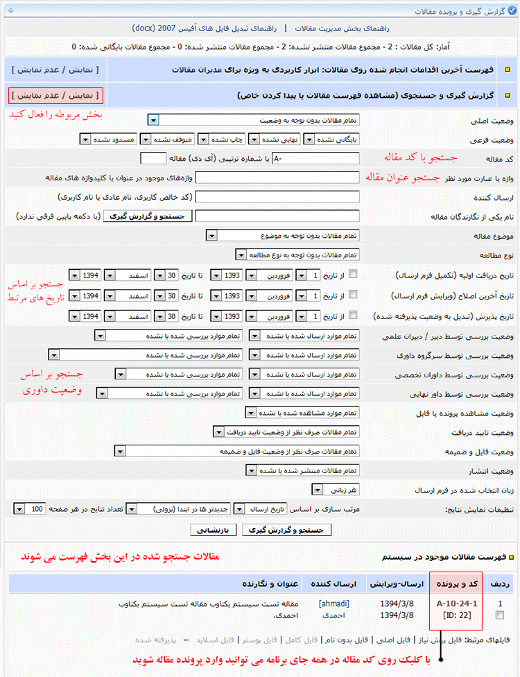بخش مقالات | فهرست و پرونده مقالات | جستجو و گزارش گیری از مقالات و ورود به پرونده مقالات برای انجام همه کارها روی مقالات |