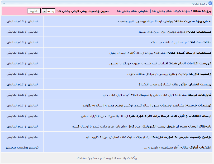 بخش مقالات | تنظیمات ویژه مقالات | تنظیم کادرها و امکانات فعال در فرم ارسال مقاله، ارسال ایمیل به کاربر، مراحل بررسی مقالات، وضعیت های مقالات، فایل های اصلی فعال برای ارسال و توضیحات کادرهای ارسال فایل، |