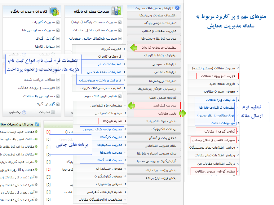 تنظیم و راه اندازی سامانه مدیریت همایش مشابه سامانه مدیریت نشریه است. برای استفاده از این سامانه لطفا ابتدا راهنمای بخش نشریات را برای دریافت و بررسی مقالات مطالعه کنید. سپس از طریق منوهای مربوطه سایر تنظیمات لازم را انجام دهید .